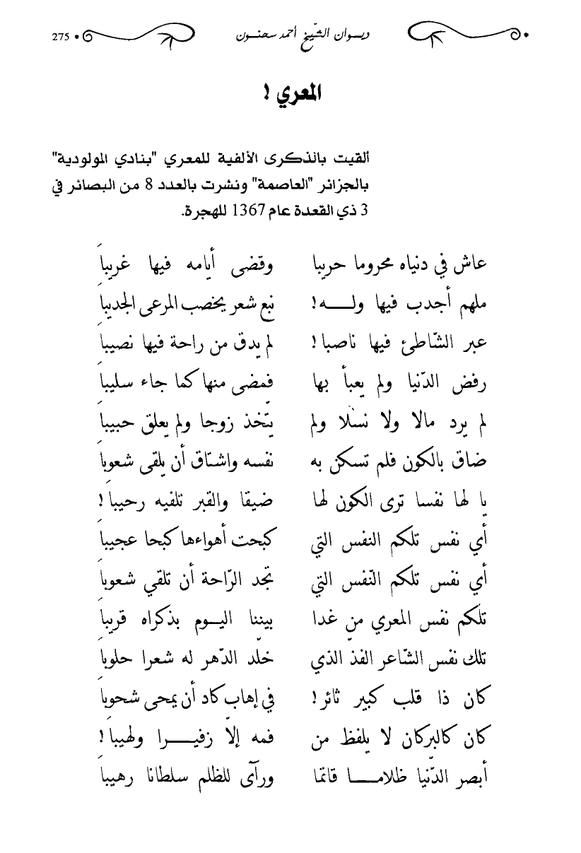 ألقيت بالذكرى الألفية للمعري "بنادي المولودية" بالجزائر "العاصمة" ونشرت بالعدد 8 من البصائر في 3 ذي القعدة عام 1367 للهجرة.
