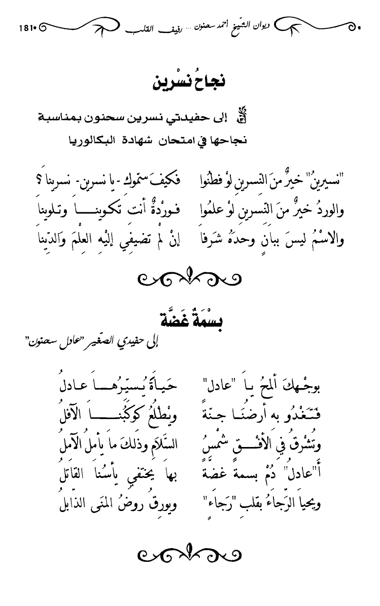 إلى حفيدتي نسرين سحنون بمناسبة نجاحها في امتحان شهادة البكالوريا. "نسيرين" خير من النسرين لو فطنوا … فكيف سموك - يا نسرين- نسرينا؟