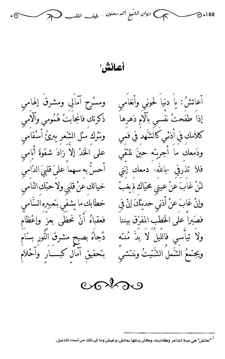 1 - "عائش" هي ابنة الشاعر وكاتبته، وكان يدللها بعائش، وعيش وما إلى ذلك من أسماء التدليل.