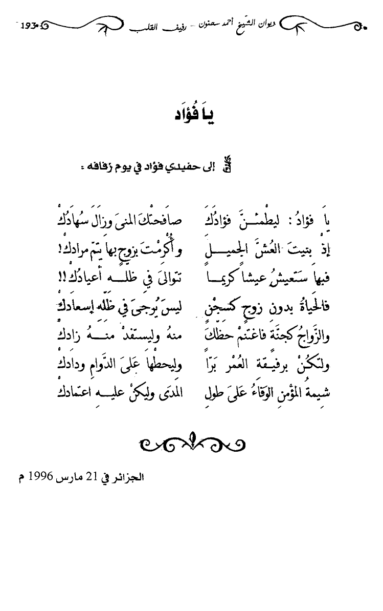 ولتكن برفيقة العمر برا … وليحطها على الدوام ودادك