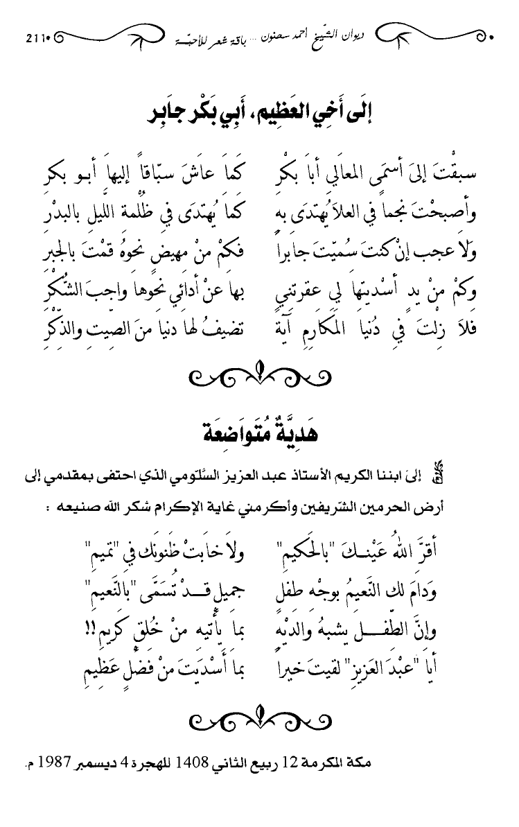 إلى ابننا الكريم الأستاذ عبد العزيز السلومي الذي احتفى بمقدمي إلى أرض الحرمين الشريفين وأكرمني غاية الإكرام شكر الله صنيعه: