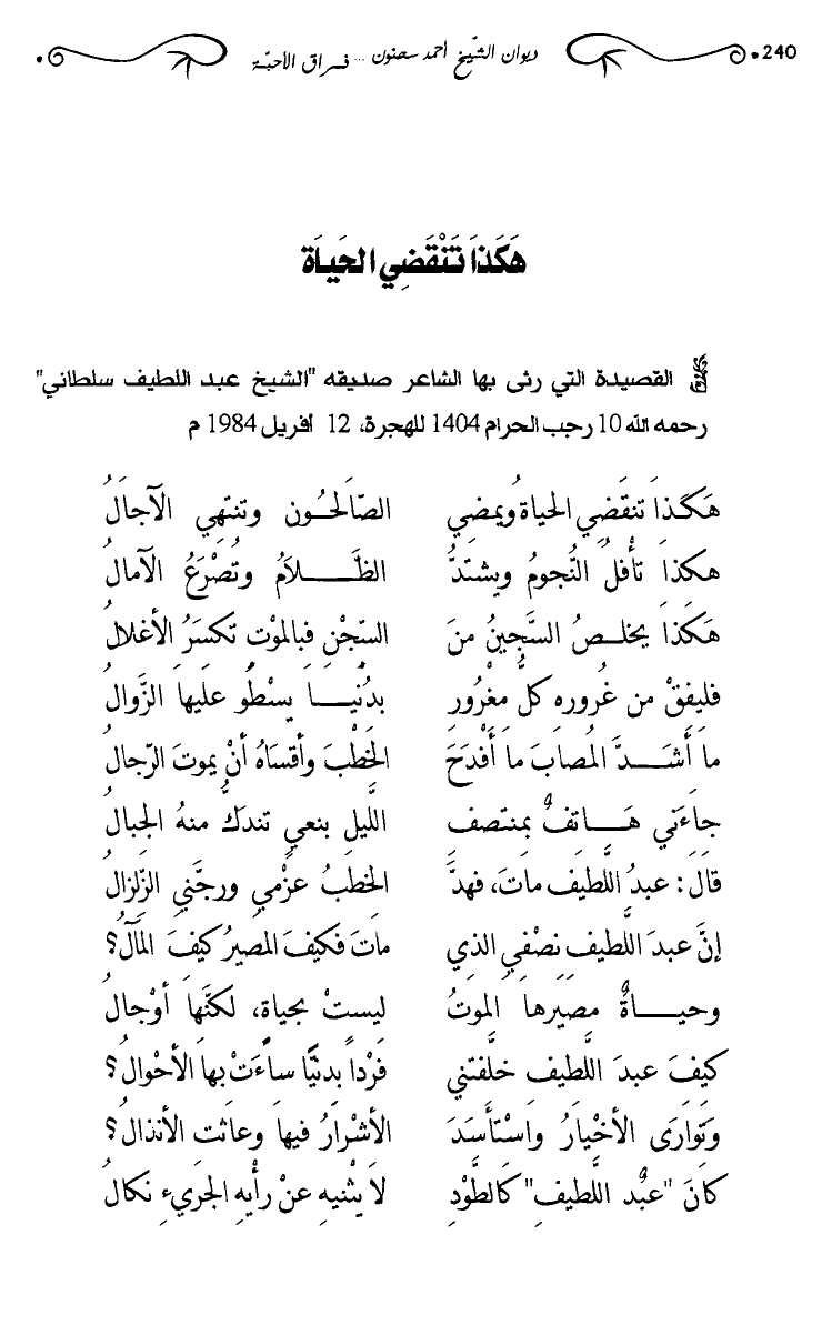 القصيدة التي رثى بها الشاعر صديقه "الشيخ عبد اللطيف سلطاني" رحمه الله 10 رجب الحرام 1404هـ للهجرة، 12 أفريل 1984م.
