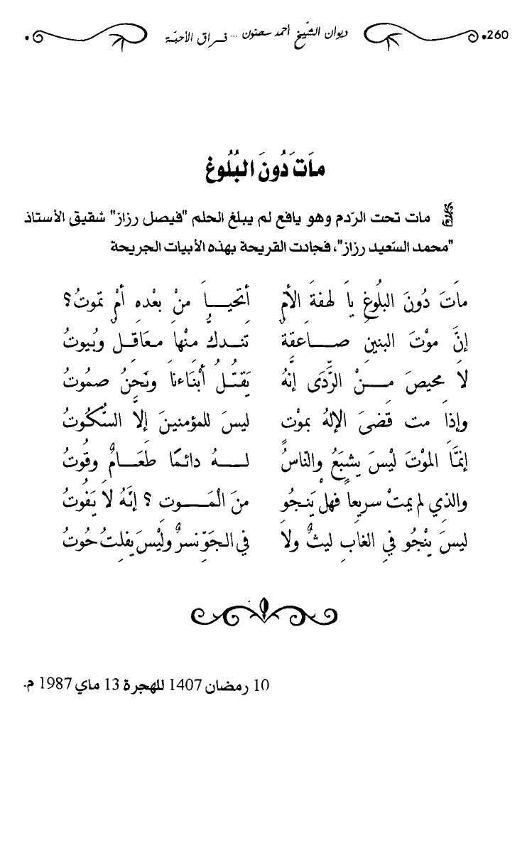 مات تحت الردم وهو يافع لم يبلغ الحلم "فيصل رزاز" شقيق الأستاذ "محمد السعيد رزاز"، فجالت القريحة بهذه الأبيات الجريحة.