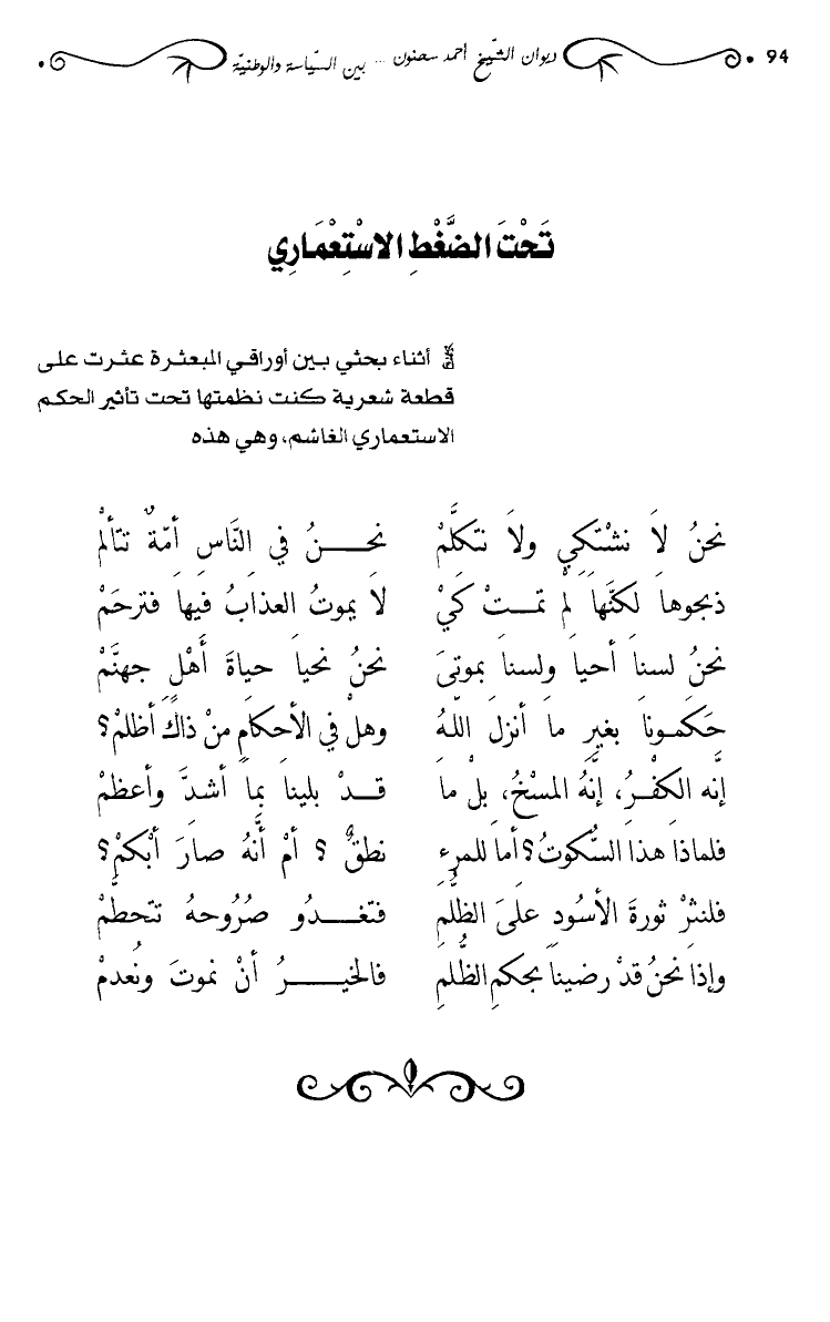 أثناء بحثي بين أوراقي المبعثرة عثرت على قطعة شعرية كنت نظمتها تحت تأثيرالحكم الاستعماري الغاشم، وهي هذه: