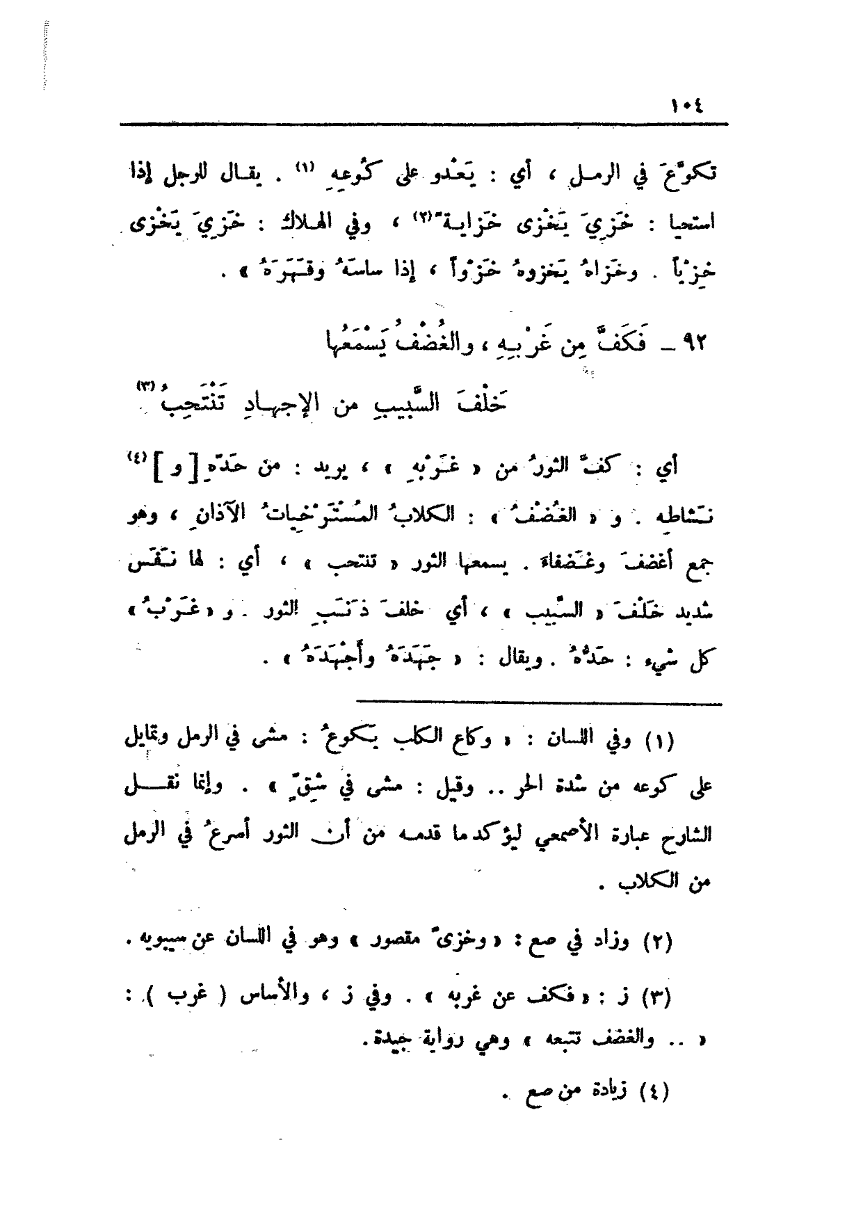 تكوَّع في الرمل، أي: يعدو على كوعه. يقال للرجل إذا استحيا: خزي يخزى خزاية، وفي الهلاك: خزي يخزى خزياً. وخزاه يخزوه خزواً، إذا ساسه وقهره".