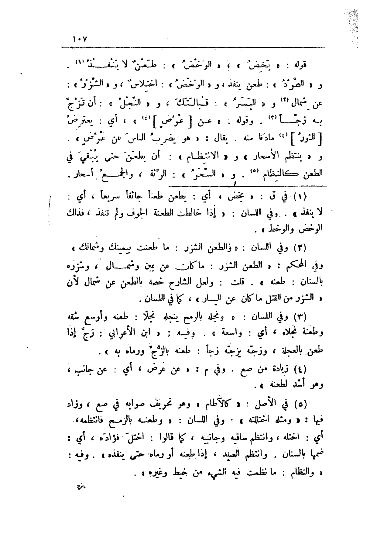 قوله: "يخض"، "الوحض": طعنٌ لا ينفذ. و"الصرد": طعن ينفذ، و"الوخض": اختلاسٌ، و"الشزر": عن شمال و"اليسر": قبالتك، و"النجل": أن تزج به زجاً. وقوله: "عن [عرضٍ] "، أي: يعترض [الثور] مادتا منه. يقال: "هو يضرب الناس عن عرضٍ". و"ينتظم الأسحار" و"الانتظام": أن يطعن حتى يبقي في الطعن كالنظام. و"السحر": الرئة، والجمع أسحار.