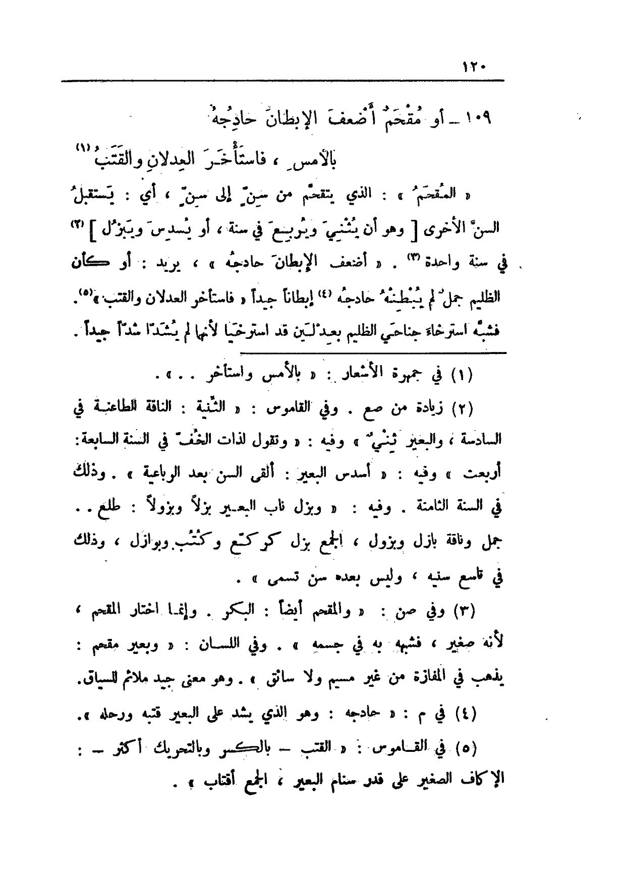 "المقحم": الذي يتقحم من سنٍ إلى سنٍ، أي: يستقبل السن الأخرى [وهو أن يُثنى ويربع في سنة، أو يسدس ويبزل] في سنة واحدة. "أضعف الإبطان حادجه"، يريد: أو كأن الظليم جملٌ لم يبطنه حادجه إبطاناً جيداً "فاستأخر العدلان والقنب". فشبه استرخاء جناحي الظليم بعد لين قد استرخيا لأنهما لم يشدا شداً جيداً.