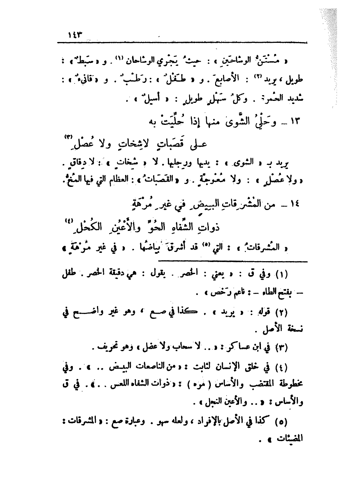 يريد بـ"الشوى": يديها ورجليها. لا "شخاتٍ": لا دقاقٍ. "ولا عُصلٍ": ولا معوجةٍ. و"القصبات": العظام التي فيها المخ.