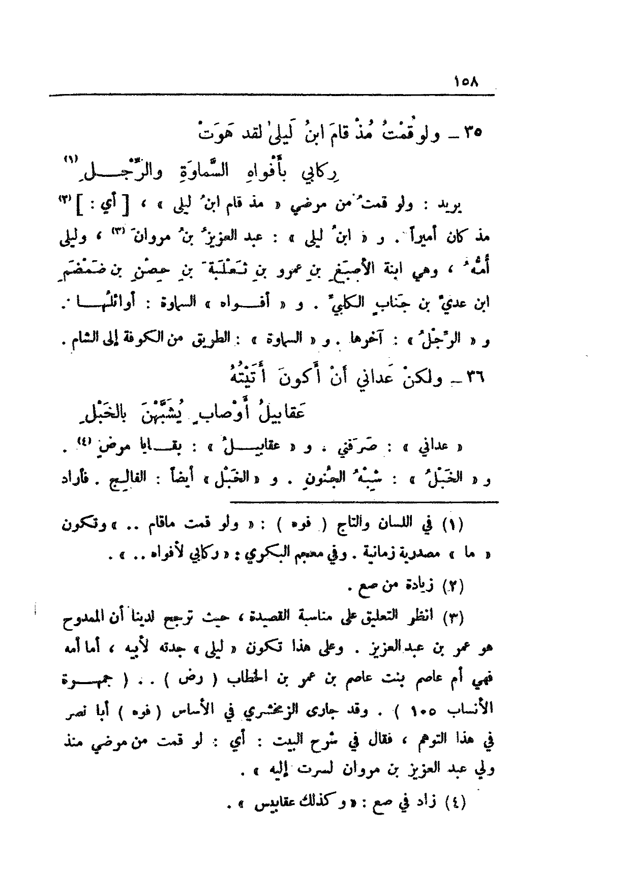يريد: ولو قمت من مرضي "مذ قام ابن ليلى"، [أي:] مذ كان أميراً. و"ابن ليلى": عبد العزيز بن مروان، وليلى أمه، وهي ابنة الأصبغ بن عمرو بن ثعلبة بن حصن بن ضمضم ابن عدي بن جنابٍ الكلبي. و"أفواه" السماوة: أوائلها. و"الرجل": آخرها. و"السماوة": الطريق من الكوفة إلى الشام.
