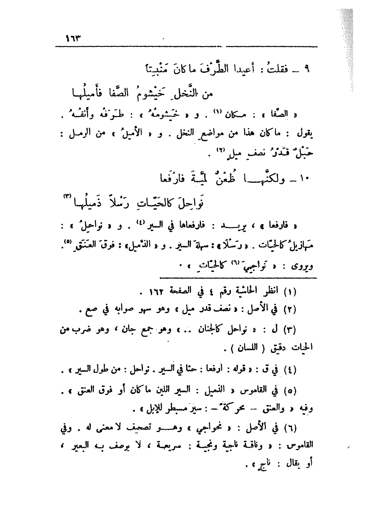 "فارفعا"، يريد: فارفعاها في السير. و"نواحل": مهازيل كالحيات. "رسلاً": سهلة السير. و"الذميل": فوق العنق. ويروى: "نواجي كالحيات".