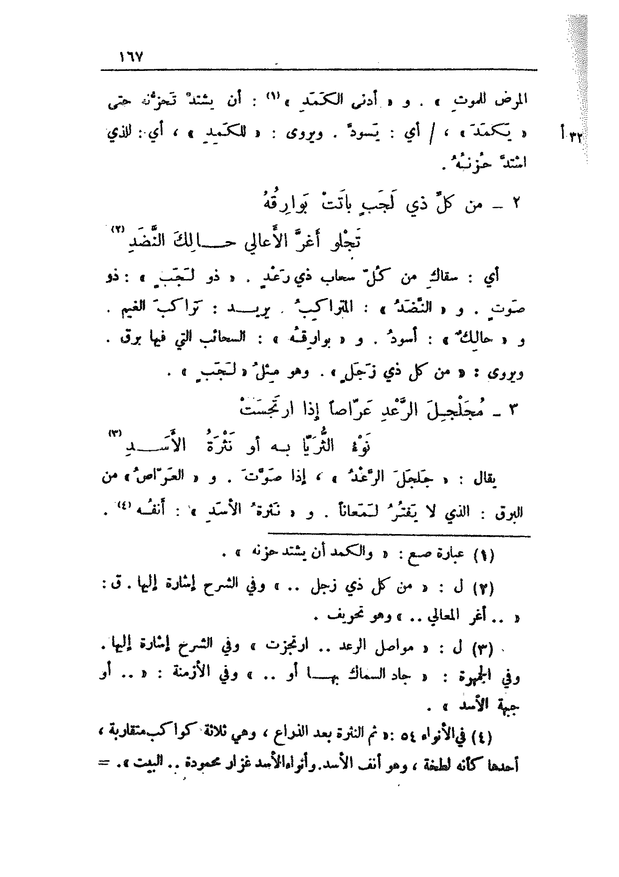 2 - من كل ذي لجبٍ": ذو صوتٍ. و"النضد": المتراكب. يريد: تراكب الغيم. و"حالكٌ": أسودُ. و"بوارقه": السحائب التي فيها برق. ويروى: "من كل ذي زجلٍ". وهو مثل "لجبٍ".