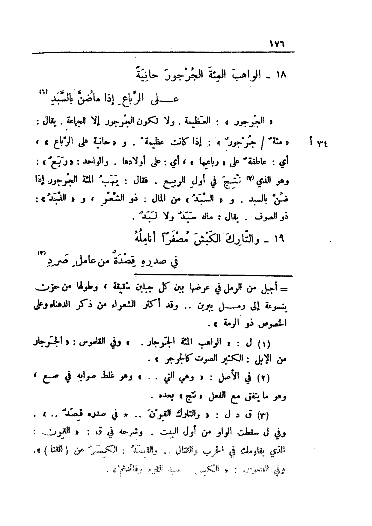 "الجرجور": العظيمة. ولا تكون الجرجور إلا للجماعة. يقال: "مئةٌ 34 أ/ جرجورٌ": إذا كانت عظيمة. و"حانية على الرباع"، أي: عاطفةٌ على "رباعها"، أي: على أولادها. والواحد: "ربعٌ": وهو الذي نتج في أول الربيع. فقال: يهب المئة الجرجر إذا ضن بالسبد. و"السبد" من المال: ذو الشعر، واللبد": ذو الصوف. يقال: ماله سبد ولا لبد.