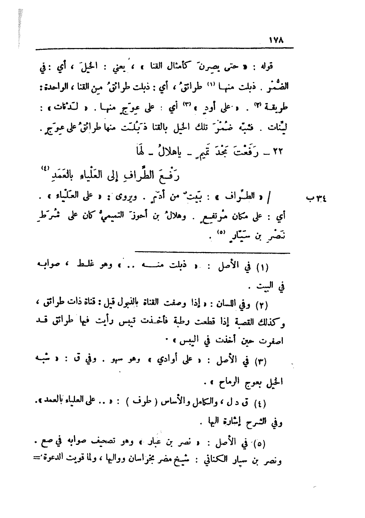 34 ب/ "الطراف": بيتٌ من أدمٍ. ويروى: على العلياء". أي: على مكان مرتفعٍ. وهلال بن أحوز التميمي كان على شُرَطِ نصر بن سيارٍ.