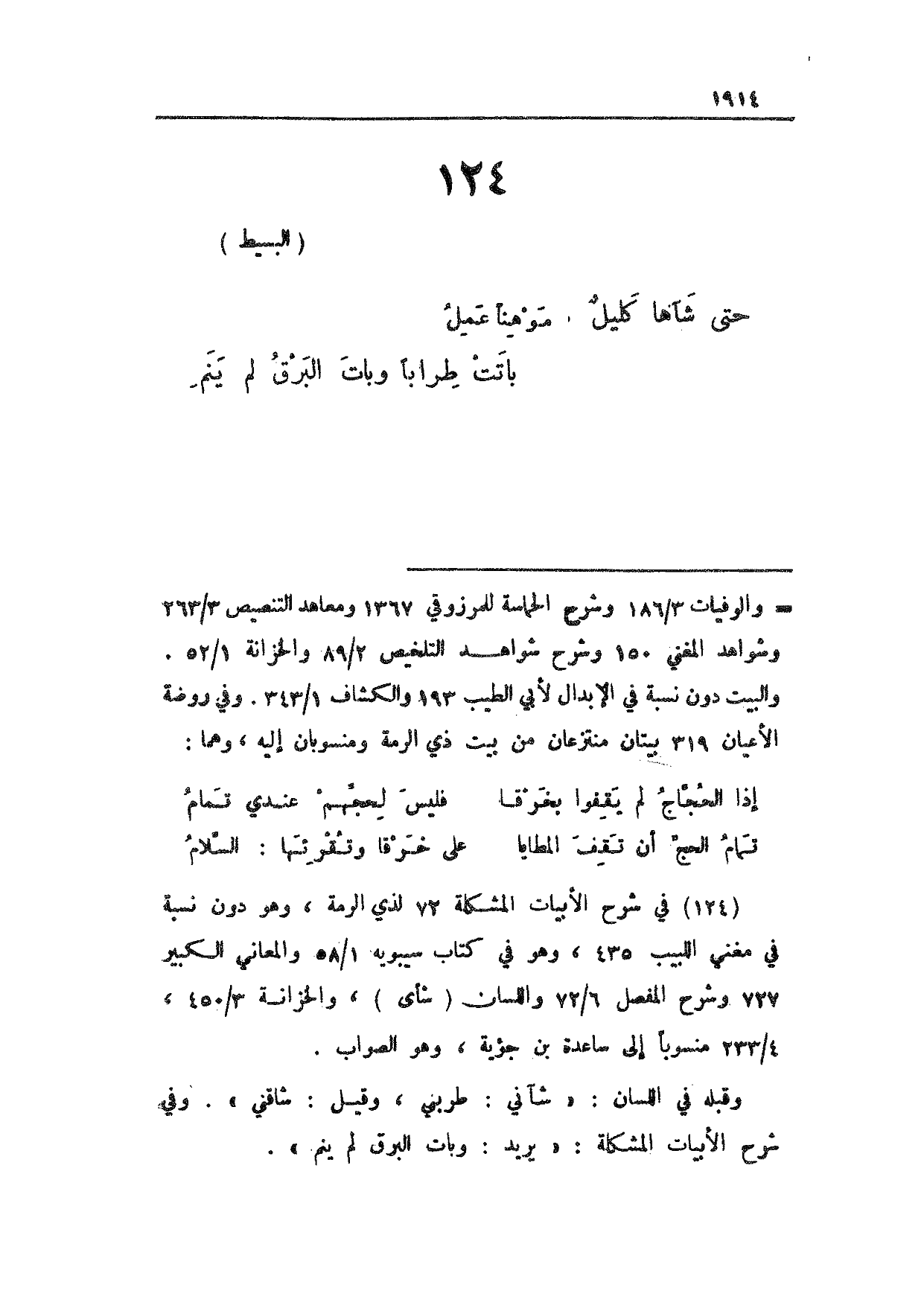 حتى شاها كليل، موهناً عمل ... باتت طراباً وبات البرق لم ينم