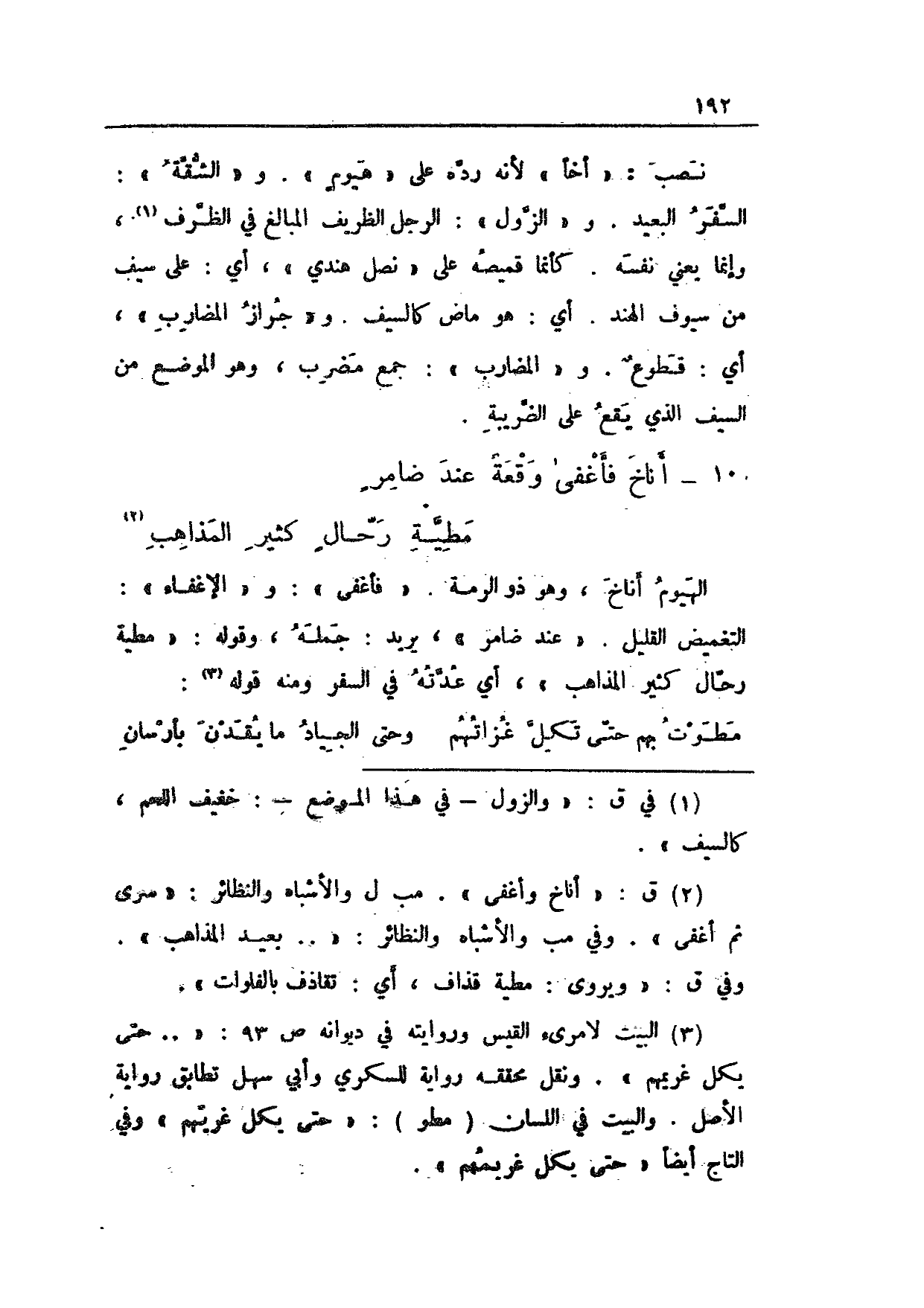 نصب: "أخاً" لأنه رده على "هيومٍ". و"الشقة": السفر البعيد. و"الزول": الرجل الظريف المبالغ في الظرف، وإنما يعني نفسه. كأنما قميصه على "نصل هندي"، أي: على سيف من سيوف الهند. أي: هو ماض كالسيف. و"جراز المضارب"، أي: قطوعٌ. و"المضارب": جمع مضرب، وهو الموضع من السيف الذي يقع على الضريبة.