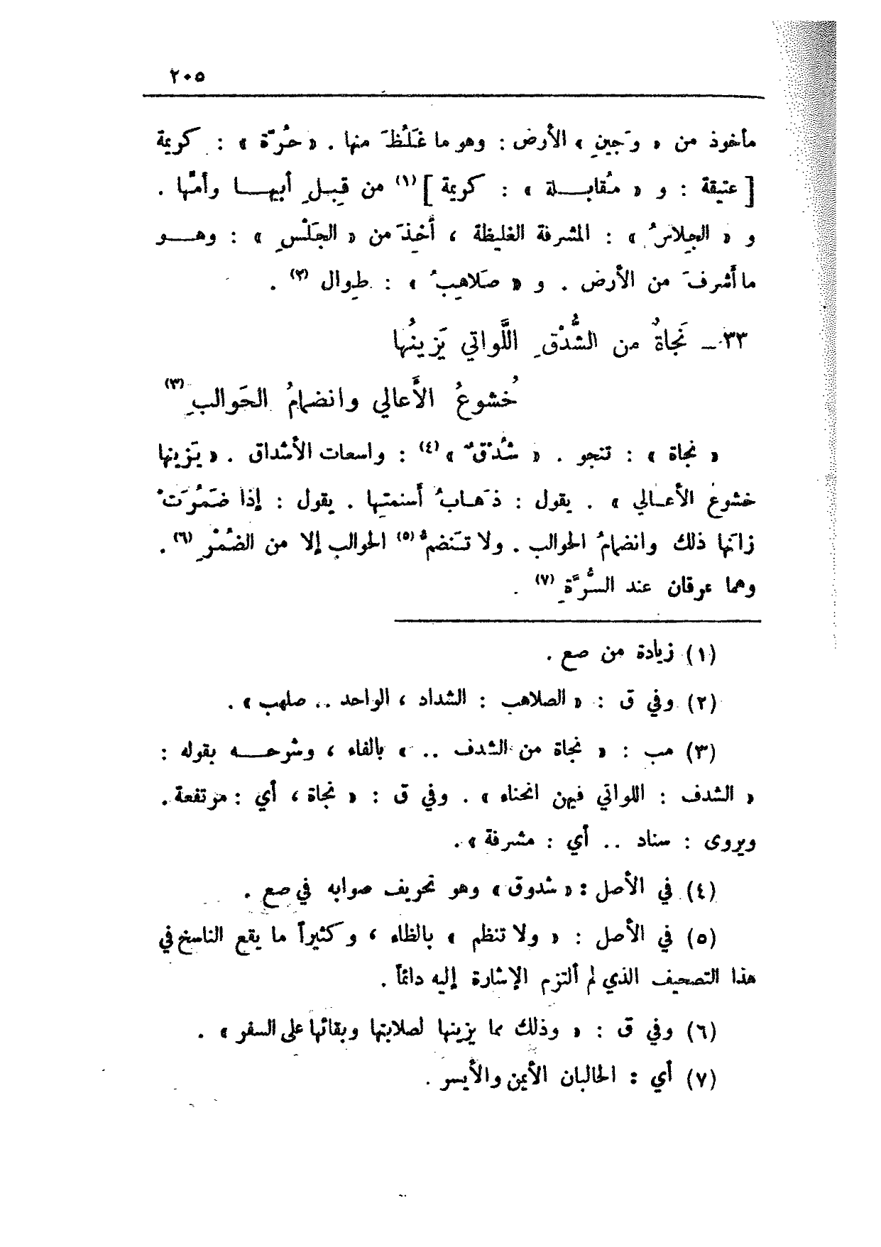 "نجاة": تنجو. "شدقٌ": واسعات الأشداق. "يزينها خشوع الأعالي". يقول: ذهابُ أسنمتها. يقول: إذا ضمرت زانها ذلك وانضمام الحوالب. ولا تنضم الحوالب إلا من الضمر. وهما عرقان عند السرة.