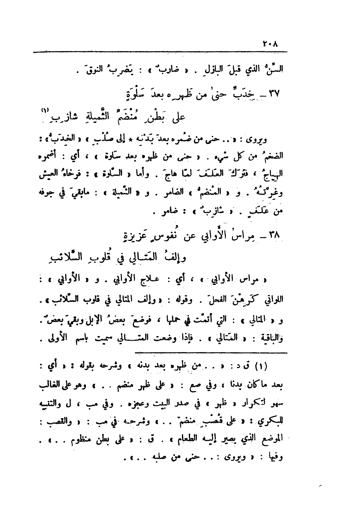 ويروى: " .. حنى من ضميره بعد بدنه * إلى صلب" "الخدب": الضخم من كل شيء. "حنى من ظهره بعد سلوة"، أي: أضمره الهياج، فترك العلف لما هاج. وأما "السلوة": فرخاء العيش وغيرته. و"المنضم" الضامر. و"الثميلة": ما بقي في جوفه من علفٍ. "شازبٌ": ضامر.