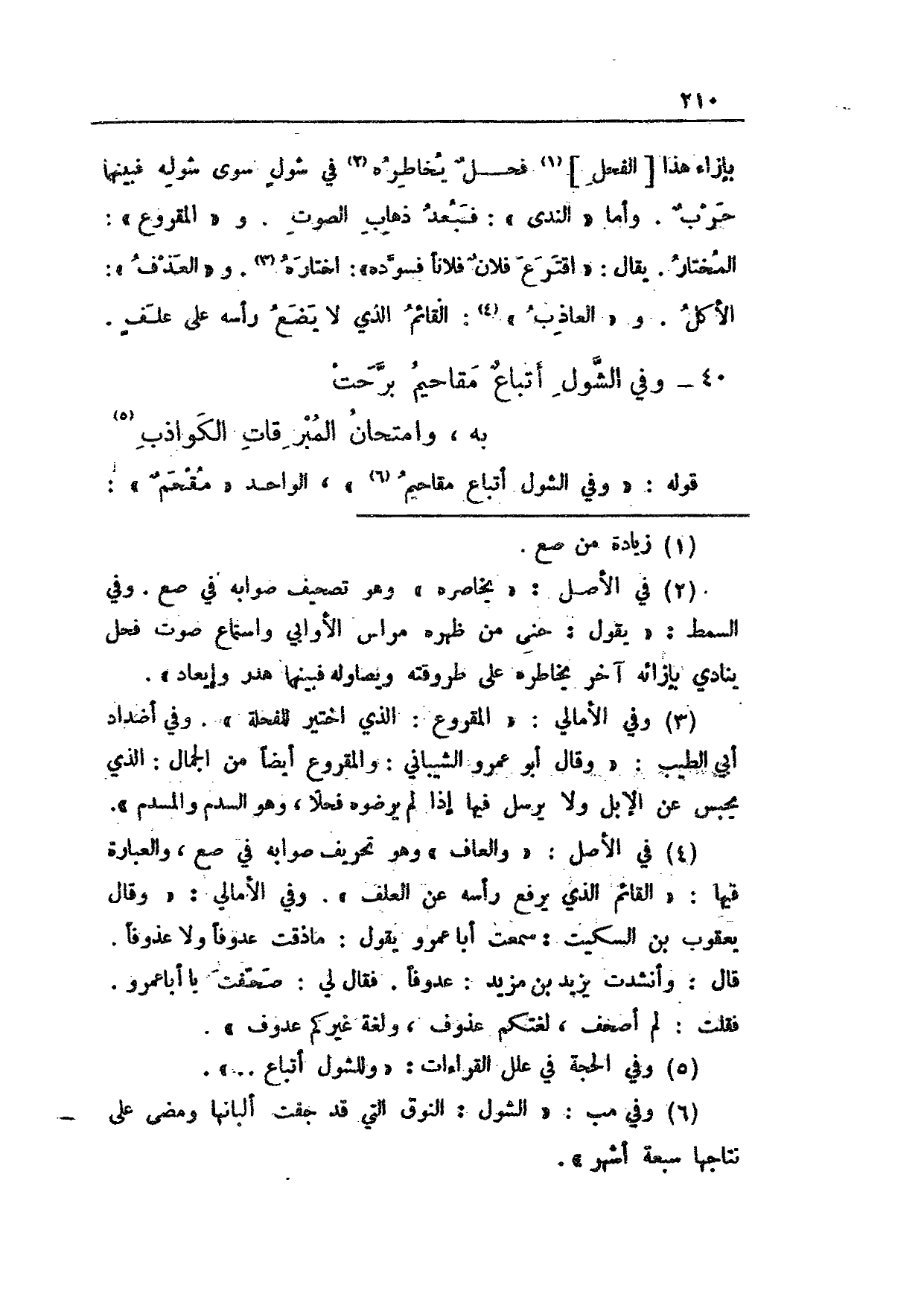 بإزاء هذا [الفحل] فحلٌ يخاطره في شولٍ سوى شوله فبينهما حربٌ. وأما "الندى": فبعد ذهاب الصوت. و"المقروع": المختار. يقال: "اقترع فلانٌ فلاناً فسوده": اختاره. و"العذف": الأكل. و"العاذب": القائم الذي لا يضع رأسه على علفٍ.
