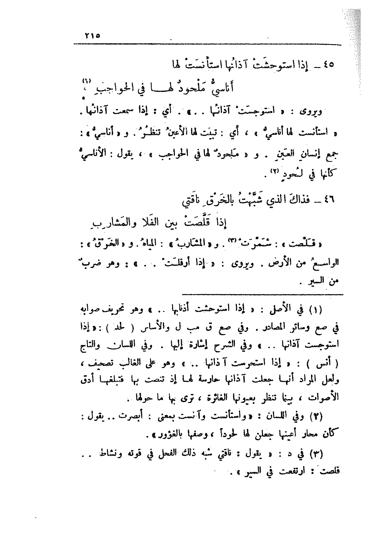 ويروى: "استوجست آذانها .. ". أي: إذا سمعت آذانها. "استأنست لها أناسي"، أي: تبيت لها الأعين تنظر. و"أناسيٌ": جمع إنسان العين. و"ملجودٌ لها في الحواجب"، يقول: الأناسي كأنها في لحودٍ.