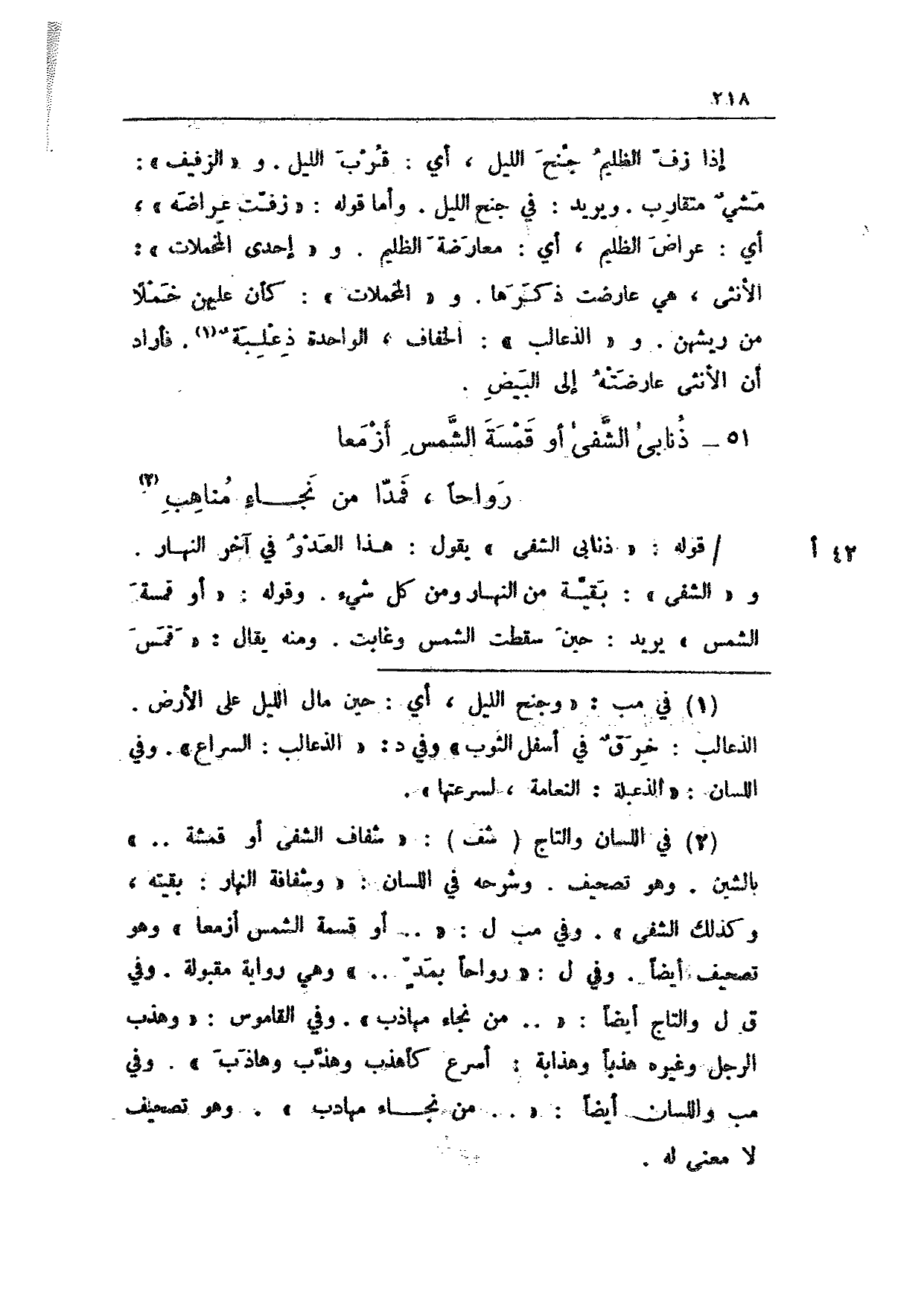 42 أ/ قوله: "ذنابي الشفى" يقول: هذا العدو في آخر النهار. و"الشفى": بقية من النهار ومن كل شيء. وقوله: "أو قمسة الشمس" يريد: حين سقطت الشمس وغابت. ومنه يقال: "قمس