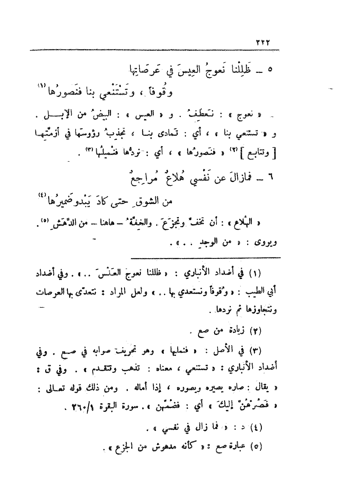 "نعوج": نعطف. و"العيس": البيض من الإبل. و"تستنعي بنا"، أي: تمادي بنا، نجذب رؤوسها في أزمتها [وتتابع] "فنصورها"، أي: نردها فنميلها.