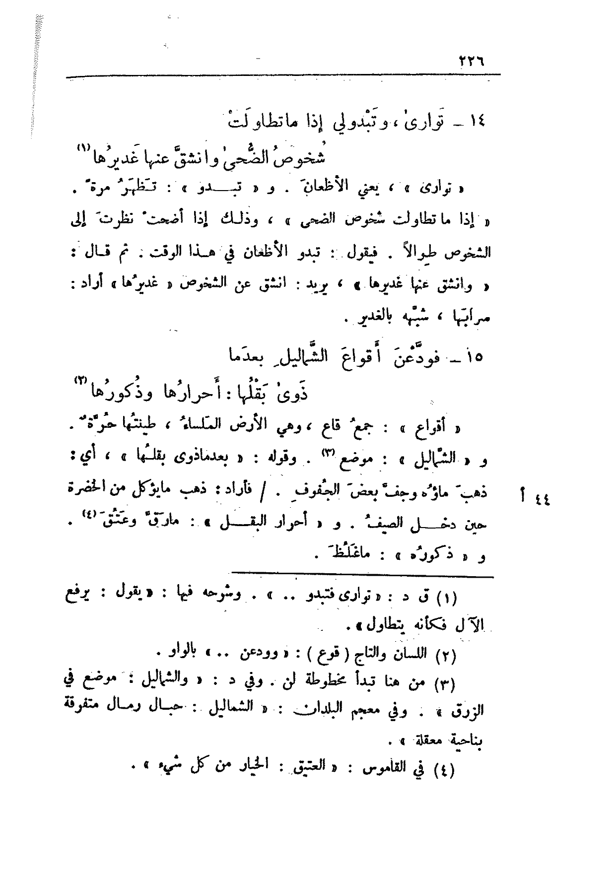 "أقراع": جمع قاع، وهي الأرض الملساء، طينتها حرةٌ. و"الشماليل": موضع. وقوله: "بعدما ذوى بقلها"، أي: ذهب ماؤه وجف بعض الجفوف. 44 أ/ فأراد: ذهب مايؤكل من الخضرة حين دخل الصيف. و"أحرار البقل": مارق وعتق. و"ذكوره": ما غلظ.