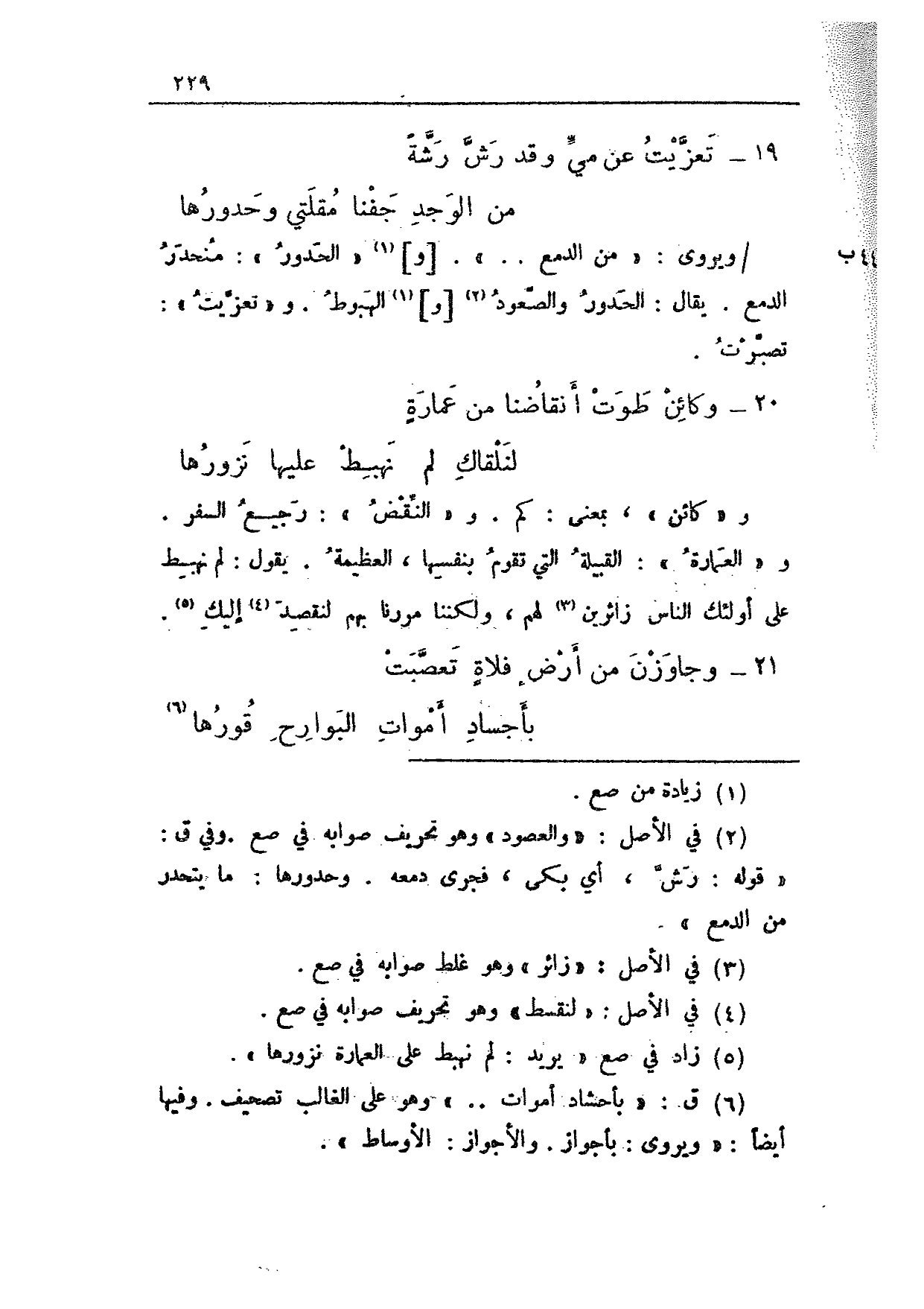 44 ب/ ويروى: "من الدمع .. ". [و] "الحدور": منحدر الدمع. يقال: الحدور والصعود [و] الهبوط. و"تعزيت": تصبرت.
