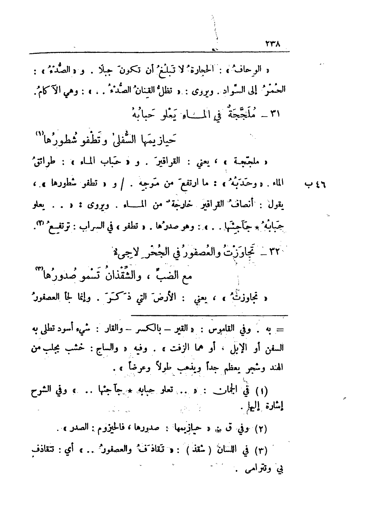 "ملججة"، يعني: القراقير. و"حباب الماء": طرائق الماء. "وحدبه": ما ارتفع من موجه. 46 ب/ و"تطفو شطورها"، يقول: أنصاف القراقير خارجةٌ من الماء. ويروى: " .. يعلو حبابه * حاجئها .. ": وهو صدرها. "تطفو" في السراب: ترتفع.