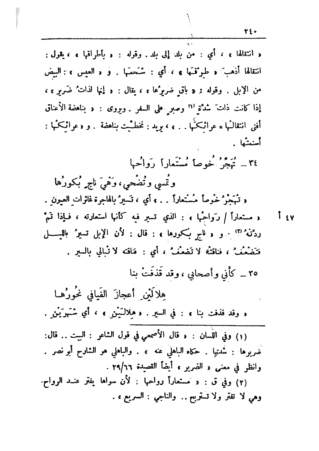 "تهجر خوصاً مستعاراً .. " أي، تسير بالهاجرة غائرات العيون. "مستعاراً 47 أ/ رواحها": الذي تسير فيه كأنها استعارته، فإذا تم ردته. و"تاجٍ بكورها": قال: لأن الإبل تسير بالليل فتضعف، فناقته لا تضعف، أي: فناقته لا تبالي بالسير.