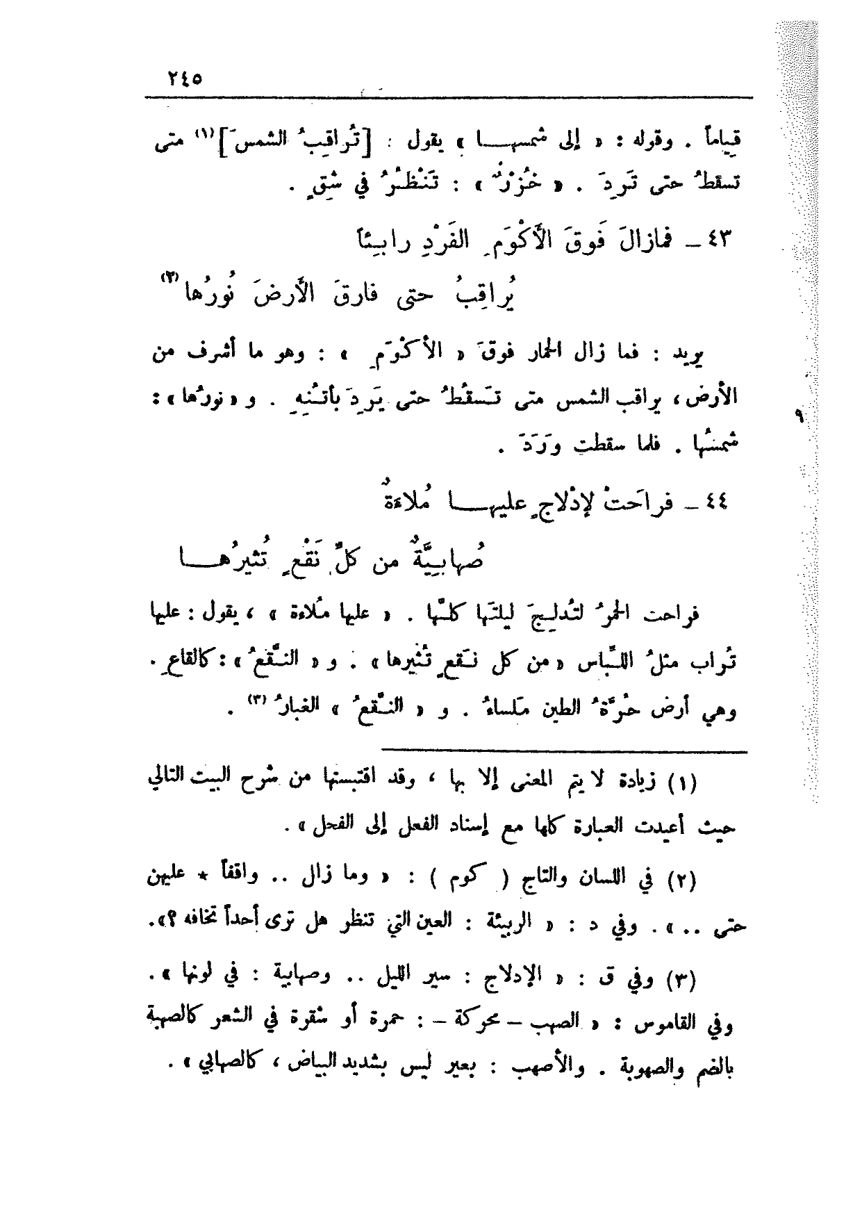 يريد: فما زال الحمار فوق "الأكوم": وهو ما أشرف من الأرض، يراقب الشمس متى تسقط حتى يرد بأتنه. و"نورها": شمسها. فلما سقطت ورد.