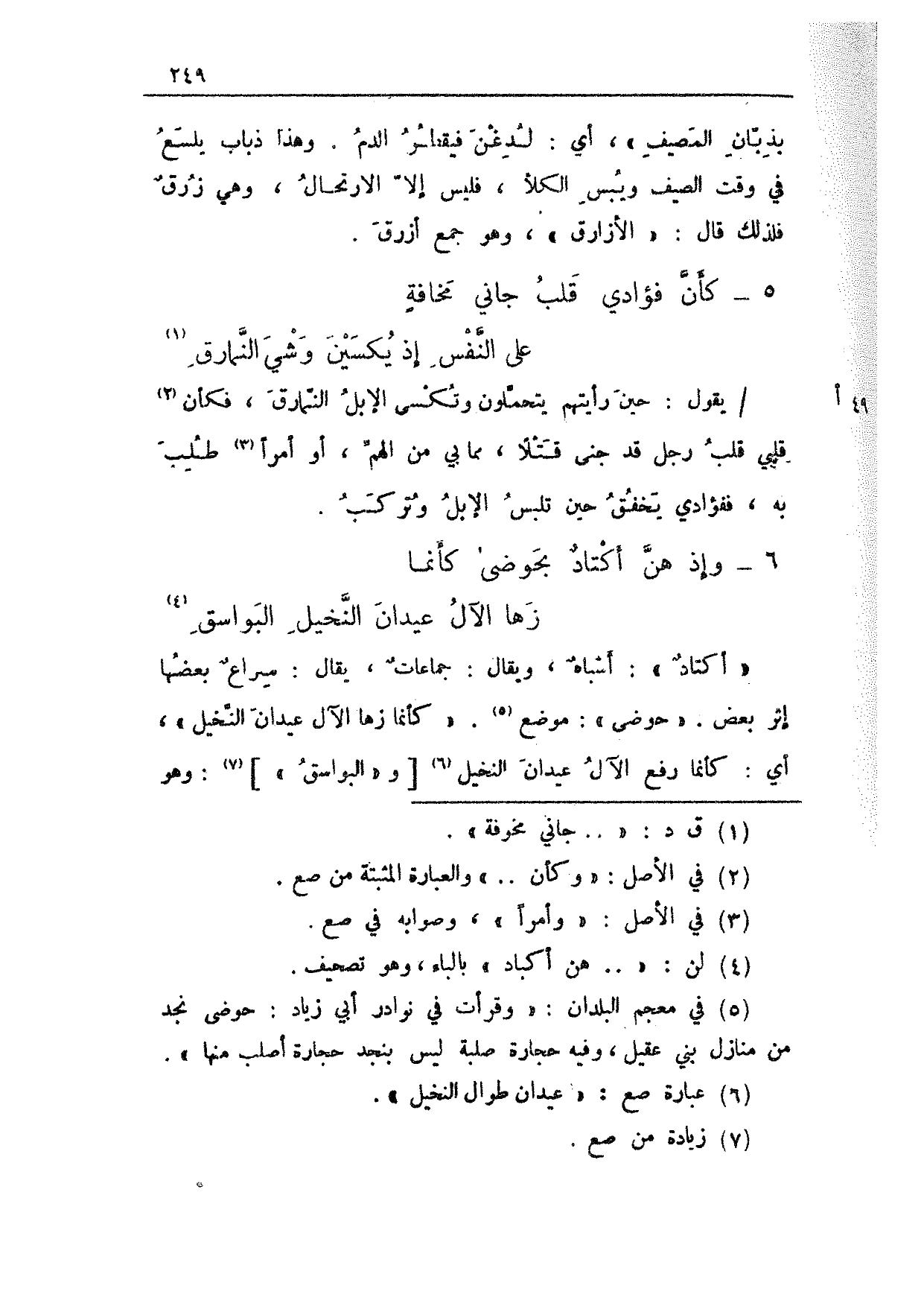 49 أ/ يقول: حين رأيتهم يتحملون وتكسى الإبل النمارق، فكأن قلبي قلب رجل قد جنى قتلاً، مما بي من الهم، أو أمراً طلب به، ففؤادي يخفق حين تلبس الإبل وتركب.