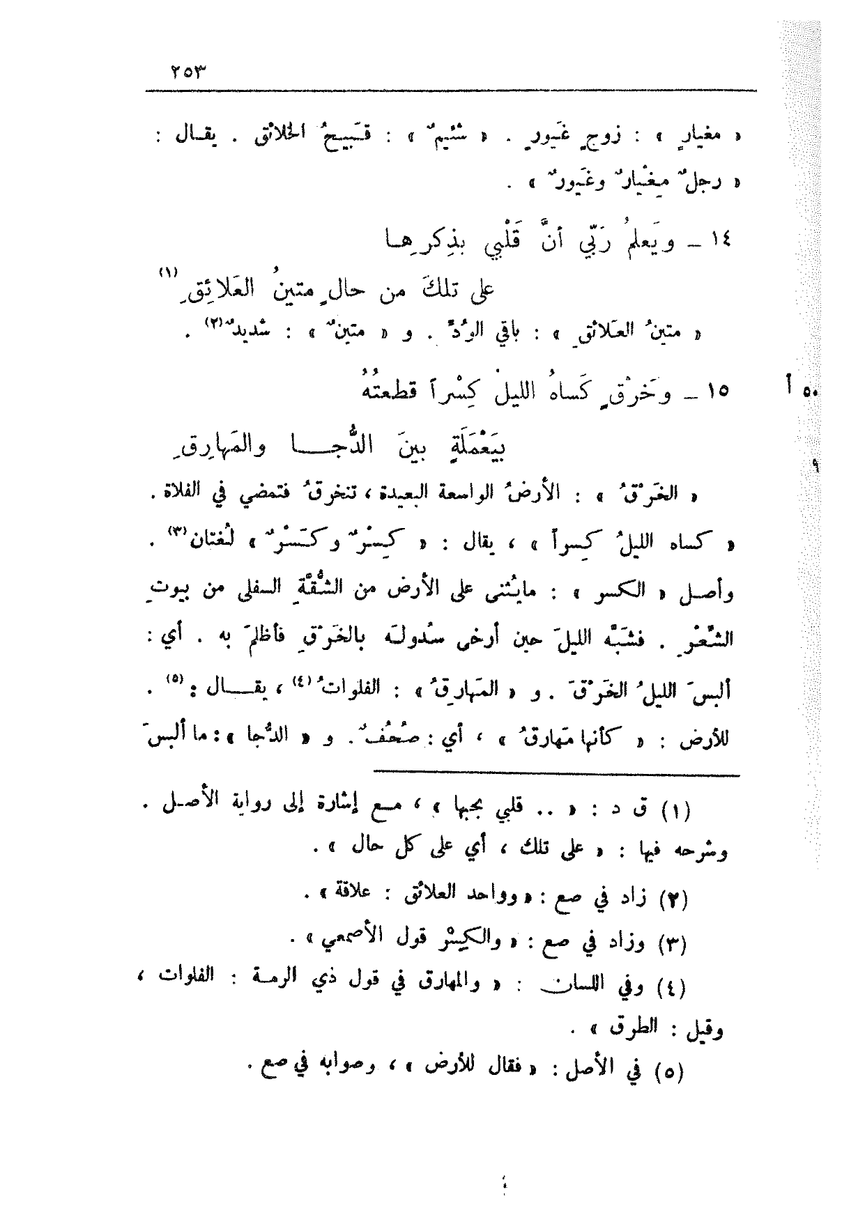 "الخرق": الأرض الواسعة البعيدة، تنخرق فتمضي في الفلاة. "كساه الليل كسراً"، يقال: "كِسْرٌ وكَسْرٌ" لغتان. وأصل "الكسر": ما يثنى على الأرض من الشقة السفلى من بيوت الشعر. فشبه الليل حين أرخى سدوله بالخر فأظلم به. أي: ألبس الليل الخرق. و"المهارق": الفلوات، يقال: لأرض: ":أنها مهارق"، أي: صحفٌ. و"الدجا": ما ألبس