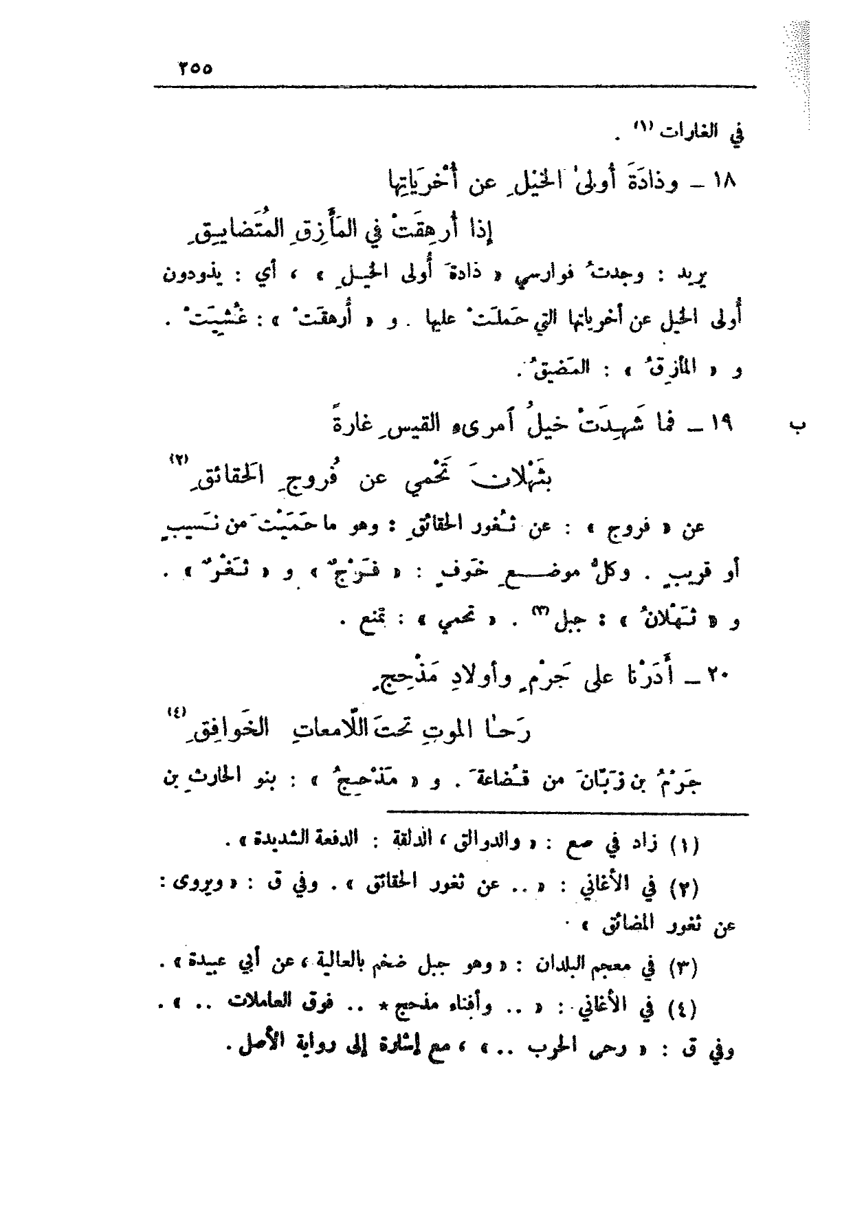 عن "فروج": عن ثغور الحقائق: وهو ما حميت من نسيب أو قريب. وكل موضعِ خوفٍ: "فرجٌ" و"ثغرٌ". و"ثهلان": جبل. "تحمي": تمنع.