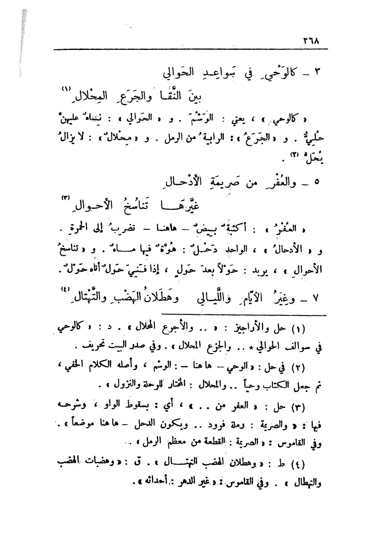 "العفو": أكثبةٌ بيضٌ - هاهنا- تضرب إلى الحمرة. و"الأدحال"، الواح دحلٌ: هوةٌ فيها ماءٌ. و"تناسخ الأحوال"، يريد: حولاً بعد حولٍ، إذا فني حولٌ أتاه حولٌ.