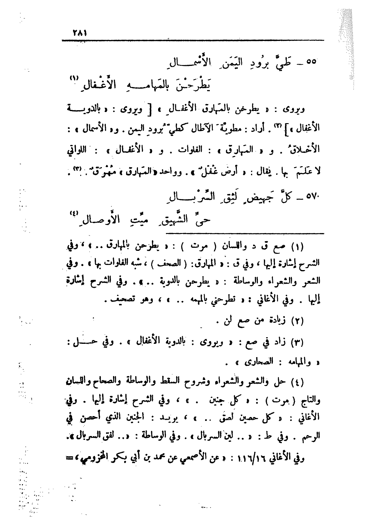 ويروى: "يطرخن بالمهارق الأغفال" [ويروى: "بالذوية الأغفال"]. أراد: مطويةً الآطال كطي برود اليمن. و"الأسمال": الأخلاق. و"المهارق": الفلوات. و"الأغفال": اللواتي لا علم بها. يقال: "أرض غفلٌ". وواحد "المهارق" مهرقٌ.