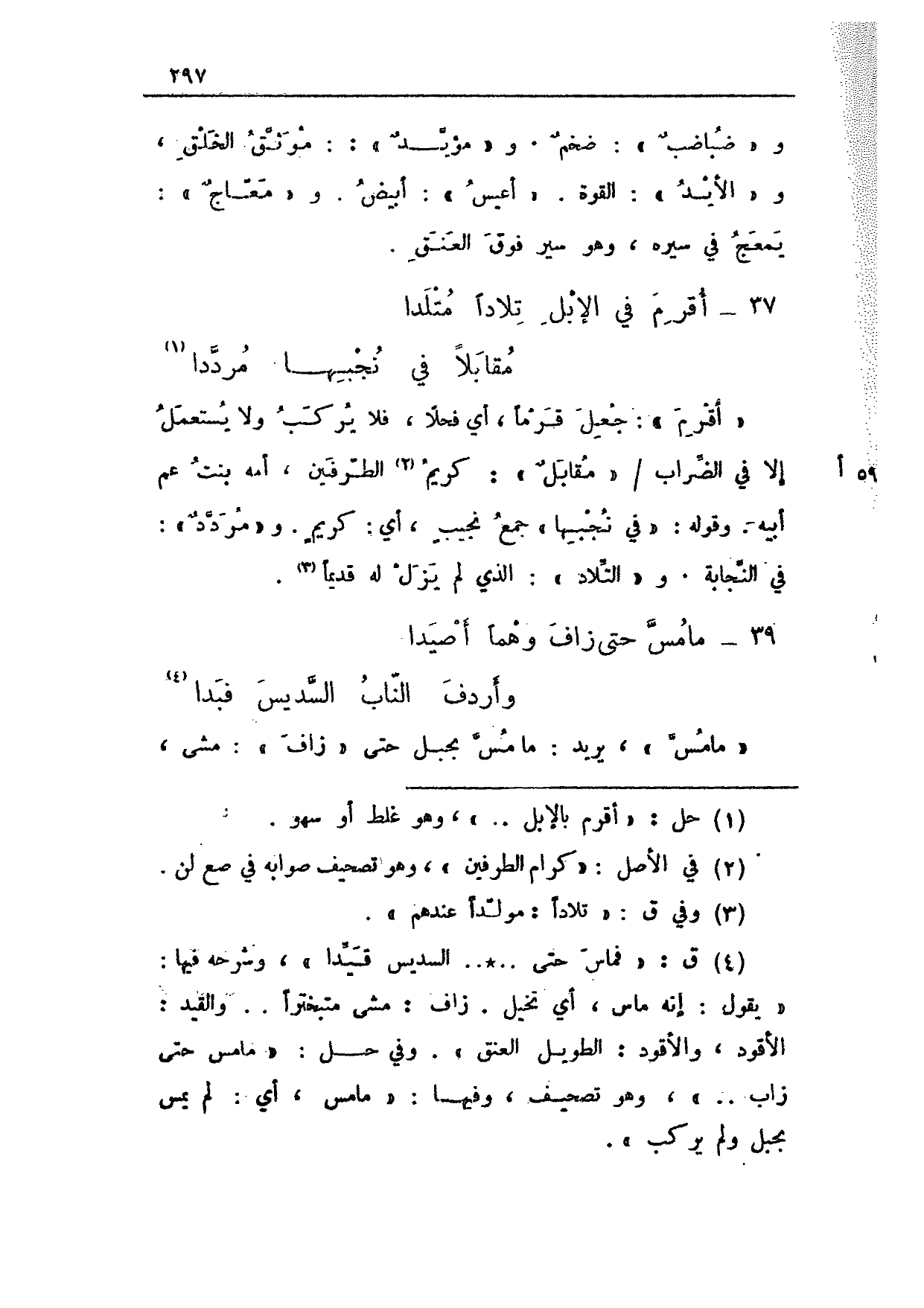 "أقرم": جعل قرماً، أي فحلاً، فلا يركب ولا يستعمل إلا في الضراب 59 أ/ "مقابلٌ": كريم الطرفين، أمه بنتُ عم أبيه. وقوله: "في نجبها" جمع نجيبٍ، أي: كريمٍ. و"مرددٌ": في النجابة. و"التلاد": الذي لم يزل له قديماً.
