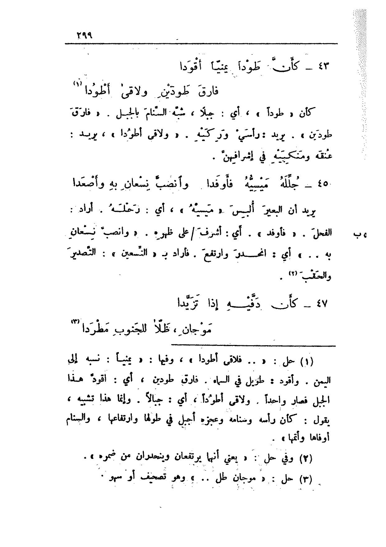 كأن "طودا"، أي: جبلاً، شبه السنام بالجبل. "فارق طودين". يريد: رأسي وركيه. "ولاقى أطودا"، يريد: عنقه ومنكبيه في إشرافهن.
