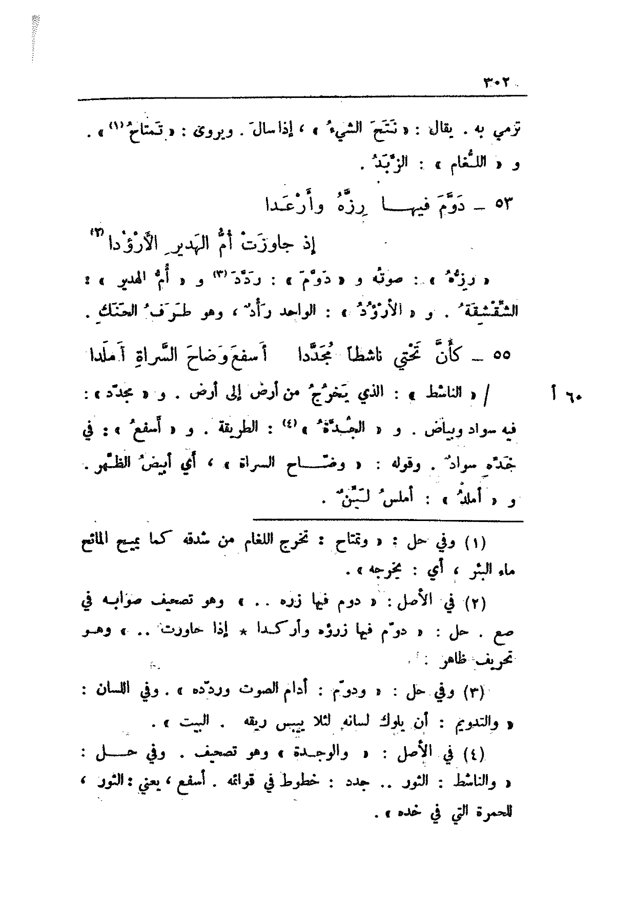 60 أ/ "الناشط": الذي يخرج من أرض إلى أرض. و"مجدد": فيه سواد وبياض. و"الجدة": الطريقة. و"أسفع": في خده سوادٌ. وقوله: "وضاح السراة"، أي أبيض الظهر. و"أملد": أملس لينٌ.
