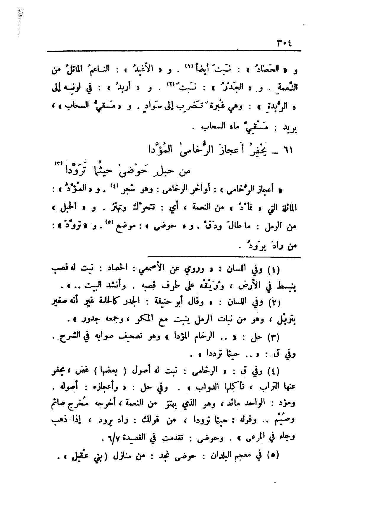 و"الحصاد": نبتٌ أيضاً. و"الأغيد": الناعم الماثل من النعمة. و"الجدر": نبتٌ. و"أربد": في لونه إلى "الربدة": وهي غبرةٌ تضرب إلى سوادٍ. و"مسقي السحاب"، يريد: مسقي ماء السحاب.