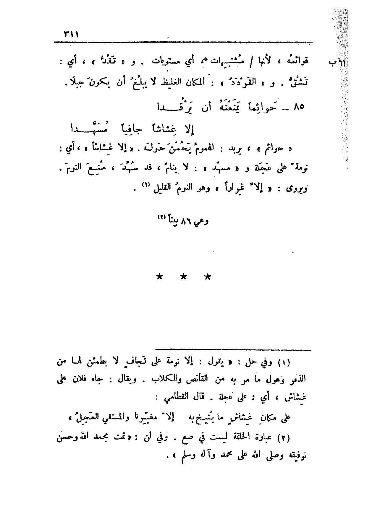 "حوائم"، يريد: الهموم يحمن حوله. "إلا غشاشاً"، أي: نومةً على عجلة و"مسهد": لا ينام، قد سهد، منع النوم. ويروى: "إلا غراراً" وهو النوم القليل.