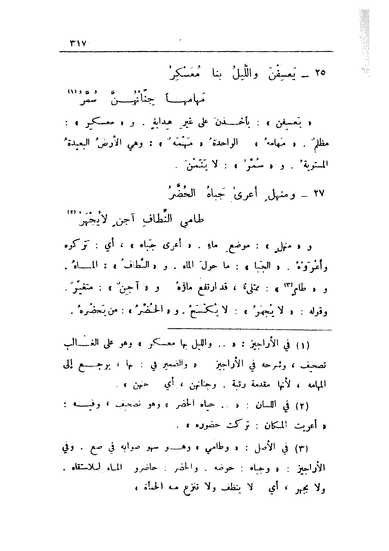"يعسفن": يأخذن على غير هدايةٍ. و"معسكر": مظلمٌ. "مهامه" الواحدة "مهمهٌ": وهي الأرض البعيدة المستوية. و"سمر": لا ينمن.