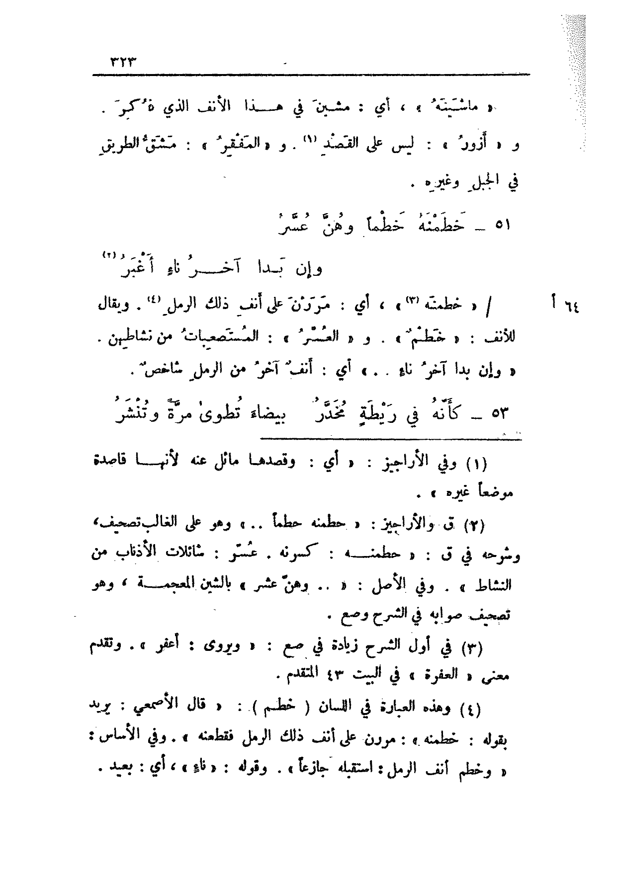 64 أ/ "خطمنه"، أي: مررن على أنف ذلك الرمل. ويقال للأنف: "خطمٌ". و"العسر": المستصعبات من نشاطهن. "وإن بدا آخر ناءٍ .. " أي: أنفٌ آخر من الرمل شاخصٌ.
