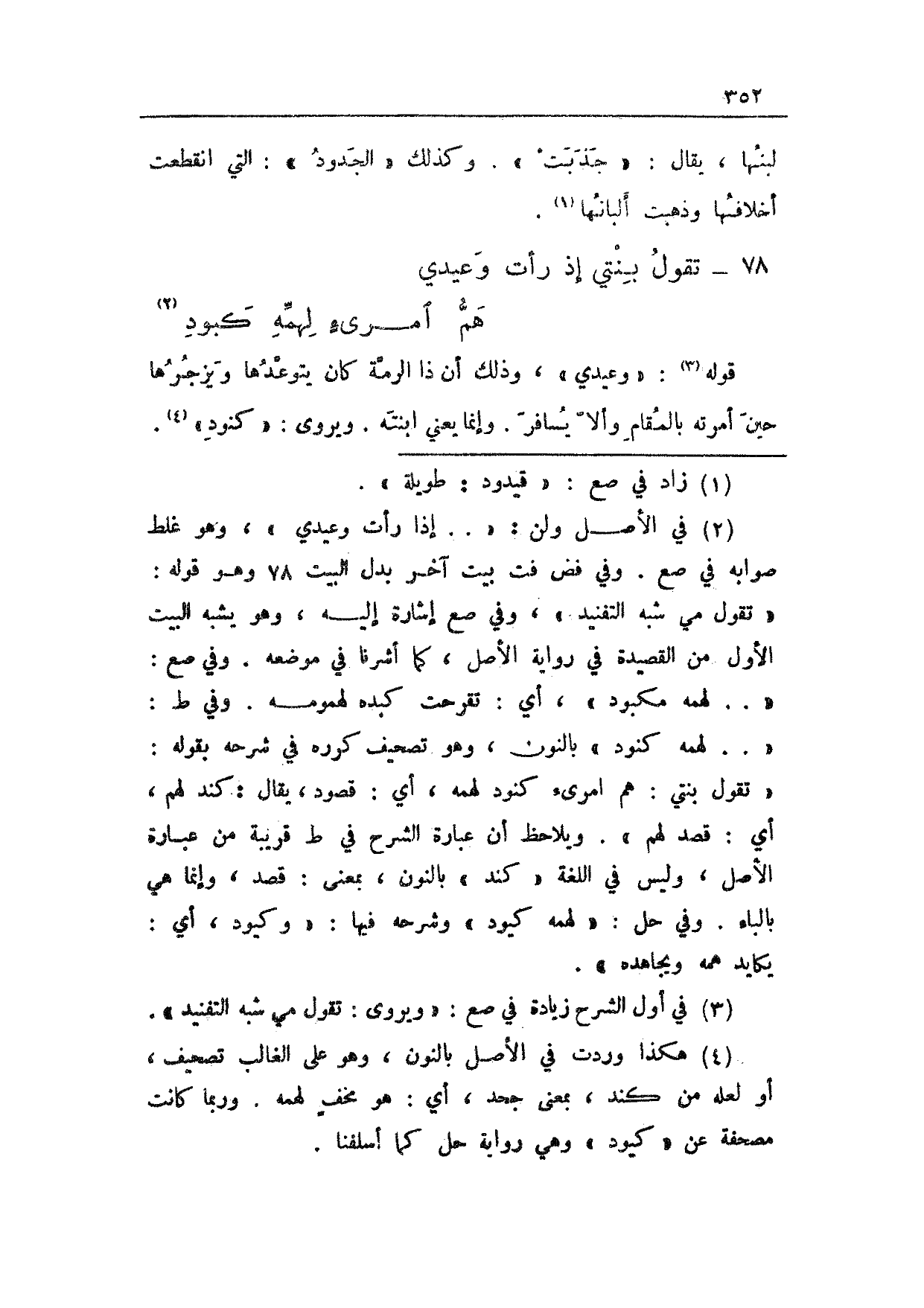 قوله: "وعيدي"، وذلك أن ذا الرمة كان يتوعدها ويزجرها حين أمرته بالمقام وألا يسافر. وإنما يعني ابنته. ويروى: "كنود".