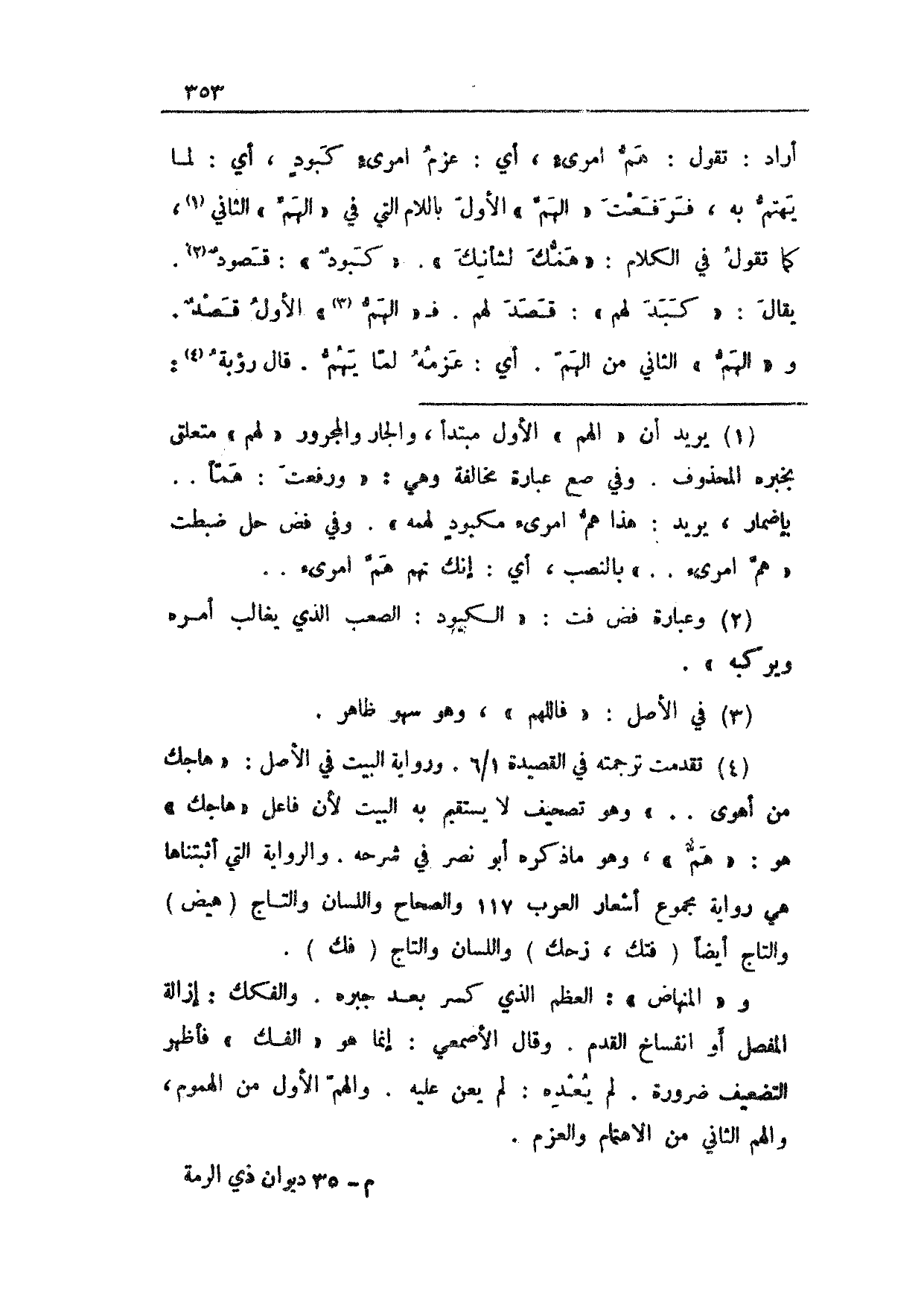 أراد: تقول: هم امريءٍ، أي: عزم امرئٍ كبودٍ، أي: لما يهتم به، فرفعت "الهم" الأول باللام التي في "الهم" الثاني، كما تقول في الكلام: "همك لشأنك". "كبودٌ": قصودٌ. يقال: "كبد لهم": قصد لهم. فـ"الهم" الأول قصدٌ. و"الهم" الثاني من الهم. أي: عزمه لما يهم. قال رؤبة: