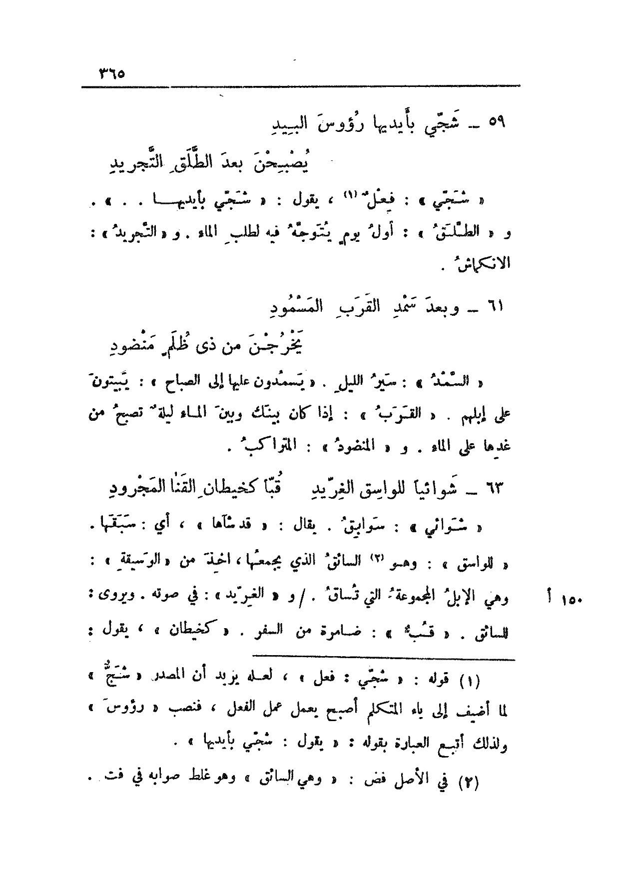 "شوائي": سوابق. يقال: "قد شآها"، أي: سبقها. "للواسق": وهو السائق الذي يجمعها، أخذ من "الوسيقة": وهي الإبل المجموعة التي تساق. 150 أ/ و"الغريد": في صوته. ويروى: السائق. "قب": ضامرة من السفر. "كخيطان"، يقول: