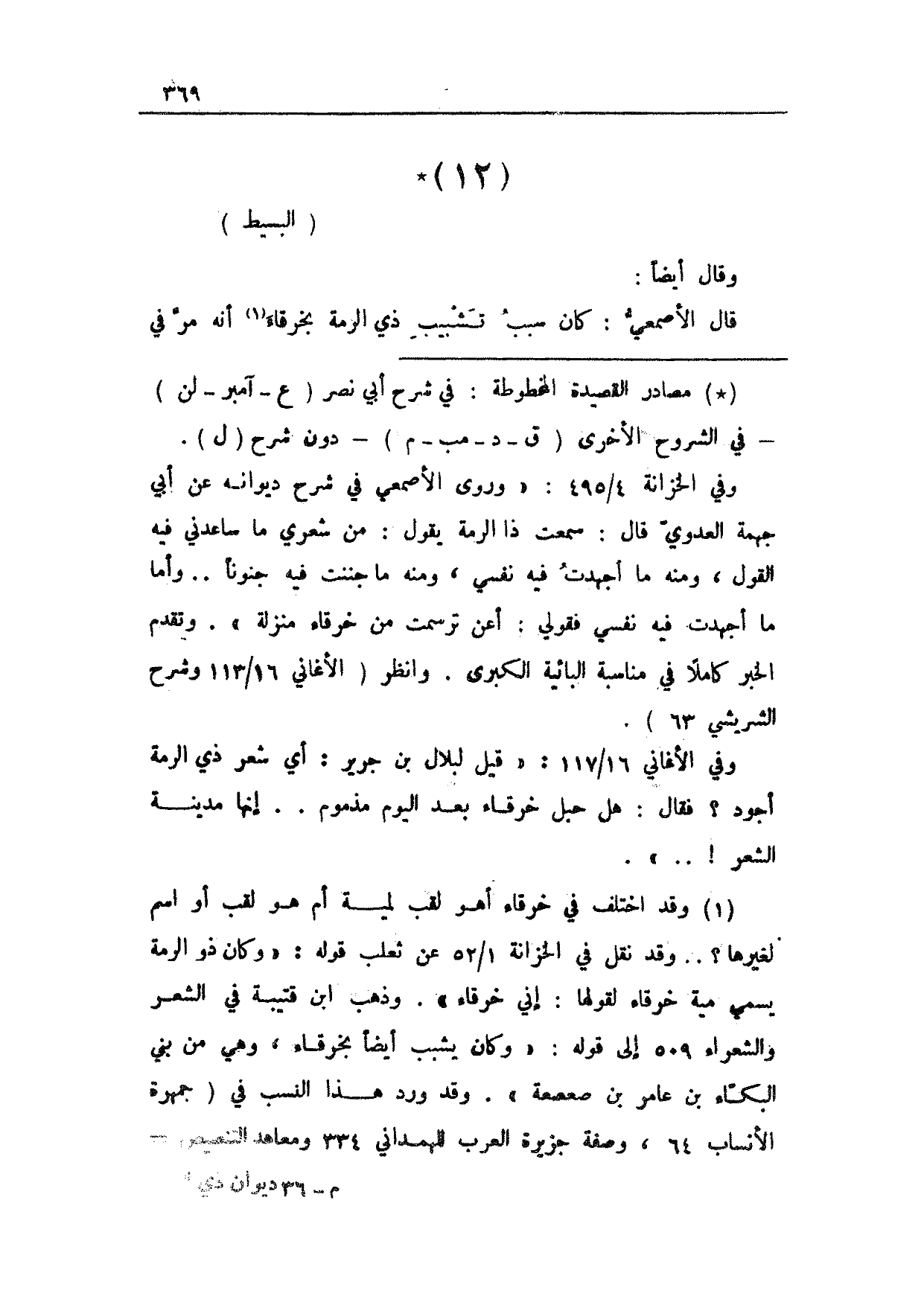 قال الأصمعي: كان سبب تشبيب ذي الرمة بخرقاء أنه مر في