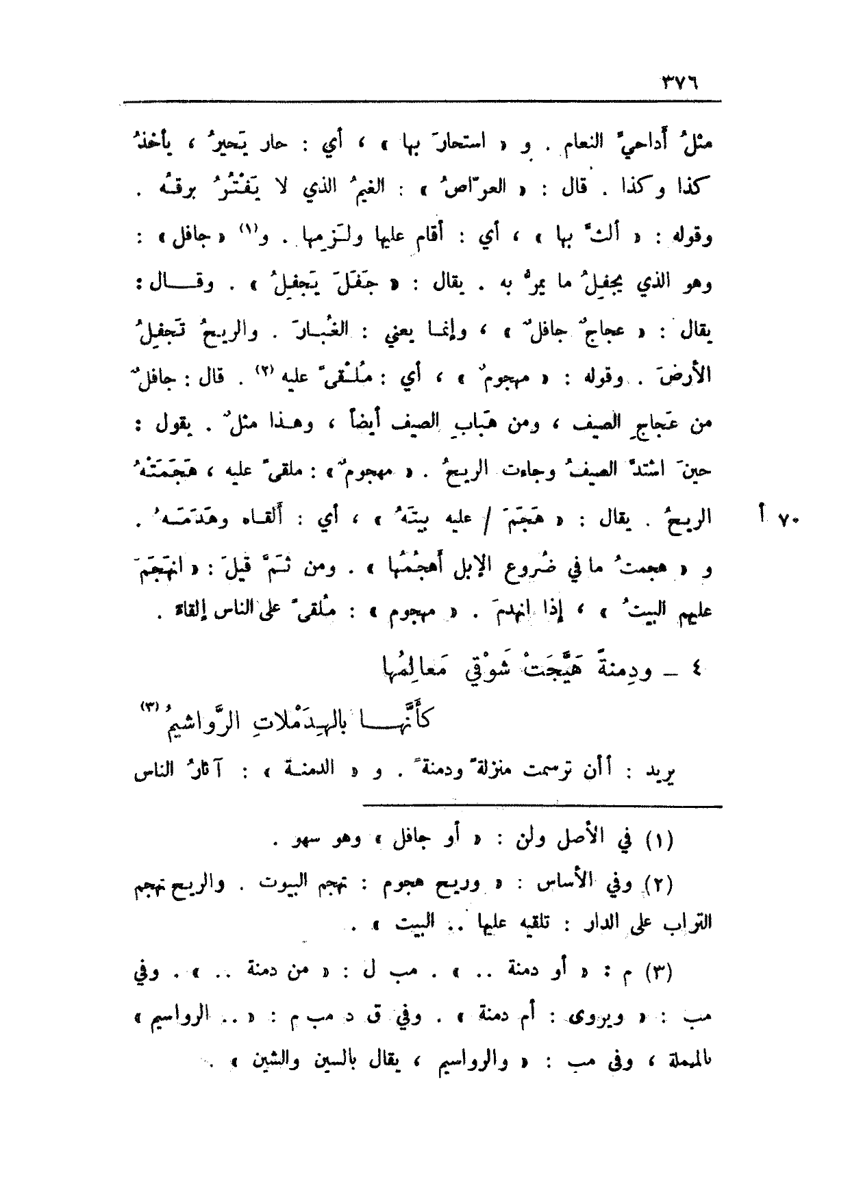 مثل أداحي النعام. و"استحار بها"، أي: حار يحيرُ، يأخذ كذا وكذا. قال: "العراصُ": الغيم الذي لا يفتر برقه. وقوله: "ألث بها"، أي: أقام عليها ولزمها. و"جافل": وهو الذي يجفل ما يمر به. يقال: "جفل يجفل". وقال: يقال: "عجاجٌ جافلٌ"، وإنما يعني: الغبار. والريح تجفل الأرض. وقوله: "مهجومٌ"، أي: ملقى عليه. قال: جافلٌ من عجاج الصيف، ومن هباب الصيف أيضاً، وهذا مثلٌ. يقول: حين اشتد الصيف وجاءت الريح. "مهجومٌ": ملقى عليه، هجمته الريح. يقال: "هجم 70 أ/ عليه بيته"، أي: ألقاه وهدمه. و"هجمت ما في ضروع الإبل أهجمها". ومن ثم قيل: "انهجم عليهم البيت"، إذا انهدم. "مهجوم": ملقى على الناس إلقاءً.