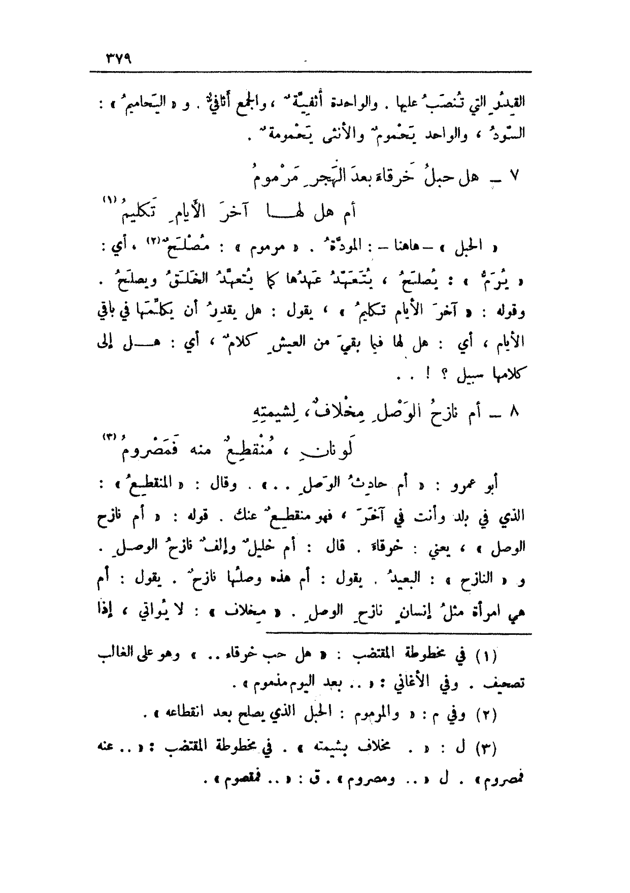 "الحبل"- هاهنا-: المودة. "مرموم": مصلحٌ، أي: "يرم": يصلح، يتعهد عهدها كما يتعهد الخلق ويصلح. وقوله: "آخر الأيام تكليم"، يقول: هل يقدر أن يكلمها في باقي الأيام، أي: هل لها فيما بقي من العيش كلامٌ، أي: هل إلى كلامها سبيل؟!