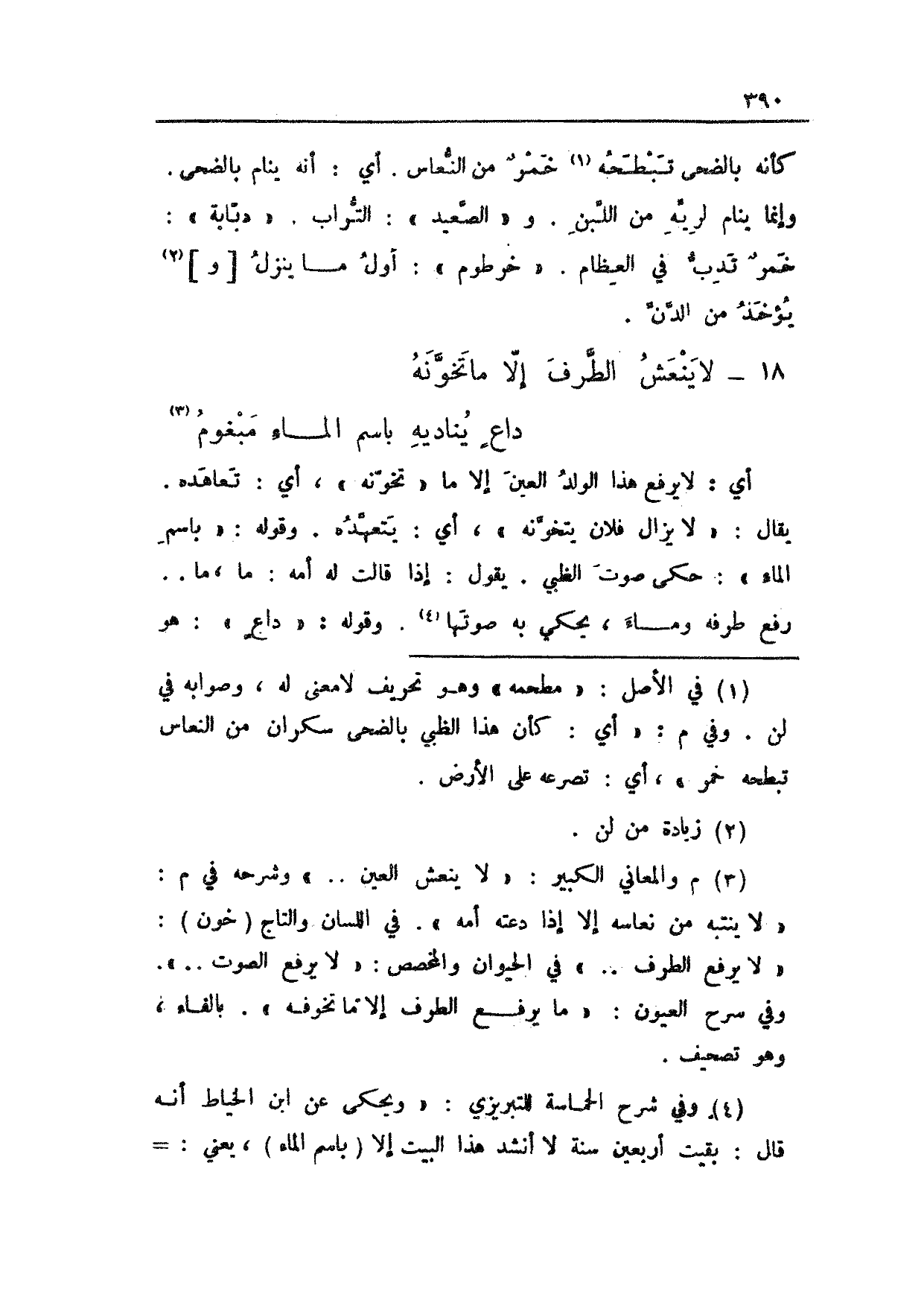 أي: لا يرفع هذا الولد العين إلا ما "تخونه"، أي: تعاهده. يقال: "لا يزال فلان يتخونه"، أي: يتعهده. وقوله: "باسم الماء": حكى صوت الظبي. يقول: إذا قالت له أمه: ما، ما .. رفع طرفه وماء، يحكي به صوتها. وقوله: "داعٍ": هو