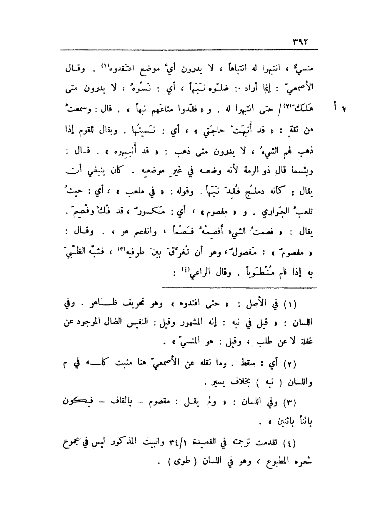 منسي، انتبهوا له انتباهاً، لا يدرون أي موضع افتقدوه. وقال الأصمعي: إنما أراد: ضلوه نبهاً، أي: نسوه، لا يدرون متى هلك 74 أ/ حتى انتبهوا له. و"فقدوا متاعهم نبهاً". قال: وسمعت من ثقةٍ: "قد أنبهت حاجتي"، أي: نسيتها. ويقال للقوم إذا ذهب لهم الشيء، لا يدرون متى ذهب: "قد أنبهوه". قال: وبئسما قال ذو الرمة لأنه وضعه في غير موضعه. كان ينبغي أن يقال: كأنه دملج فقد نبها. وقوله: "في ملعب"، أي: حيث تلعب الجواري. و"مفصوم"، أي: مكسورٌ، قد فك وفصم. يقال: "فصمت الشيء أفصمه فصماً، وانفصم هو". وقال: "مفصومٌ": مفصولٌ، وهو أن تفرق بين طرفيه، فشبه الظبي به إذا نام منطوياً. وقال الراعي: